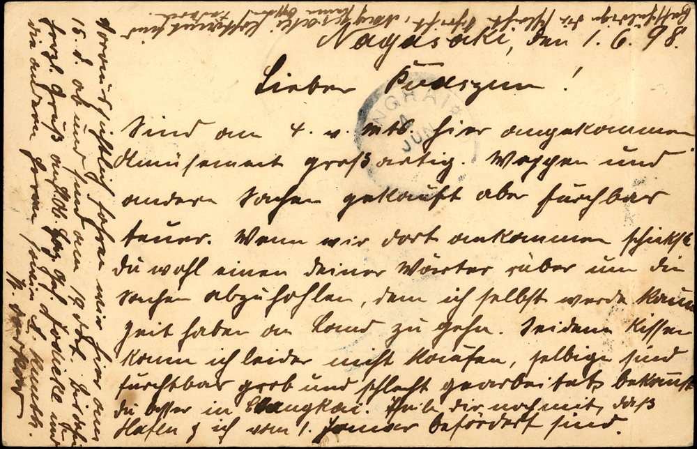 萬國郵便聯合端書4錢片,1898年長崎寄青島,銷日本NAGASAKI 1.JUN.98,經上海4.JUN.98大圓戳,煙台7.JUN.98大圓戳,青島19/6.98德國客郵到戳 源流:郵史研究第28期『膠州郵史續探』第15頁原件,2011.3海峽兩岸郵史研究會出版(Page 6)
