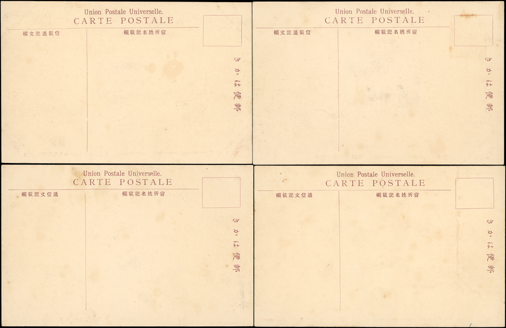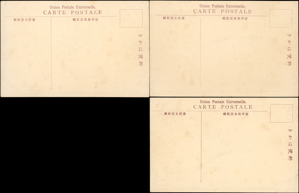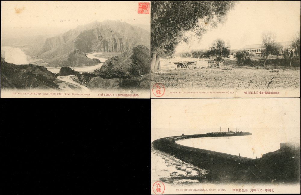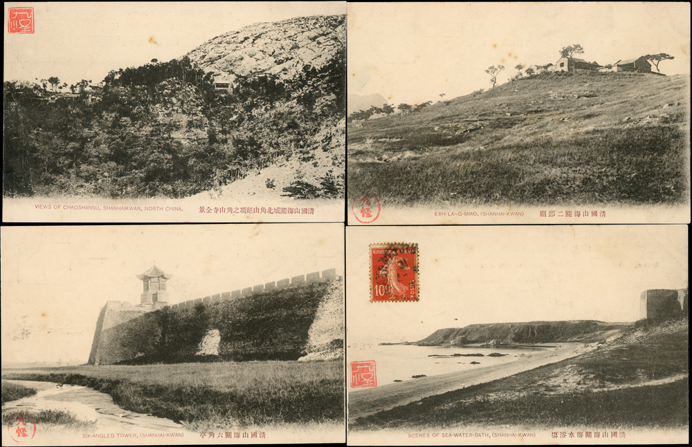 早期清國系列黑白片7片不同,包括:山海關角山,山海關六角亭,山海關海水浴場(圖案面貼1枚舊票),山海關城北角山絕頂之角山寺全景,山海關二郎廟,山海關駐屯日本軍兵營,秦皇島棧橋,圖案面均蓋『九怪』收藏章,未使用(Page 7)