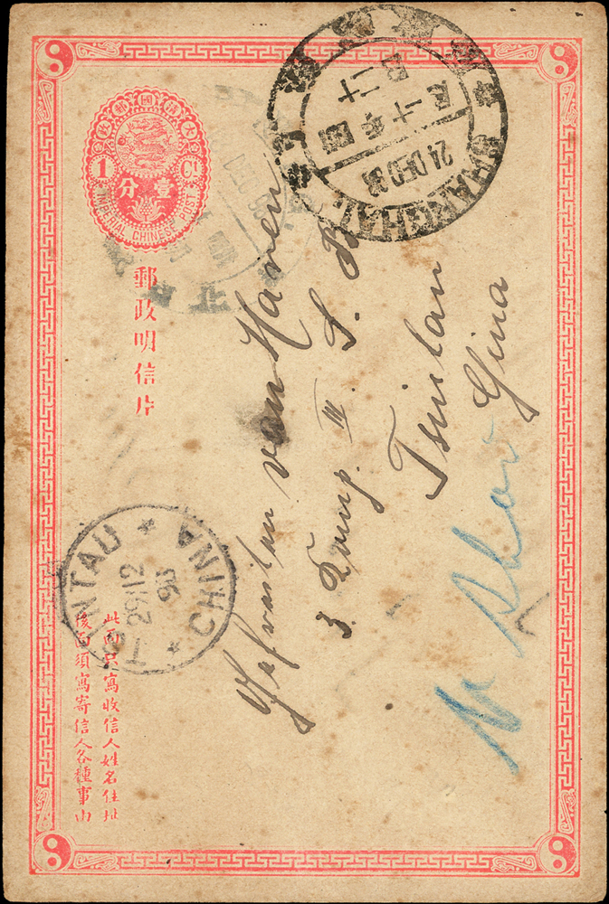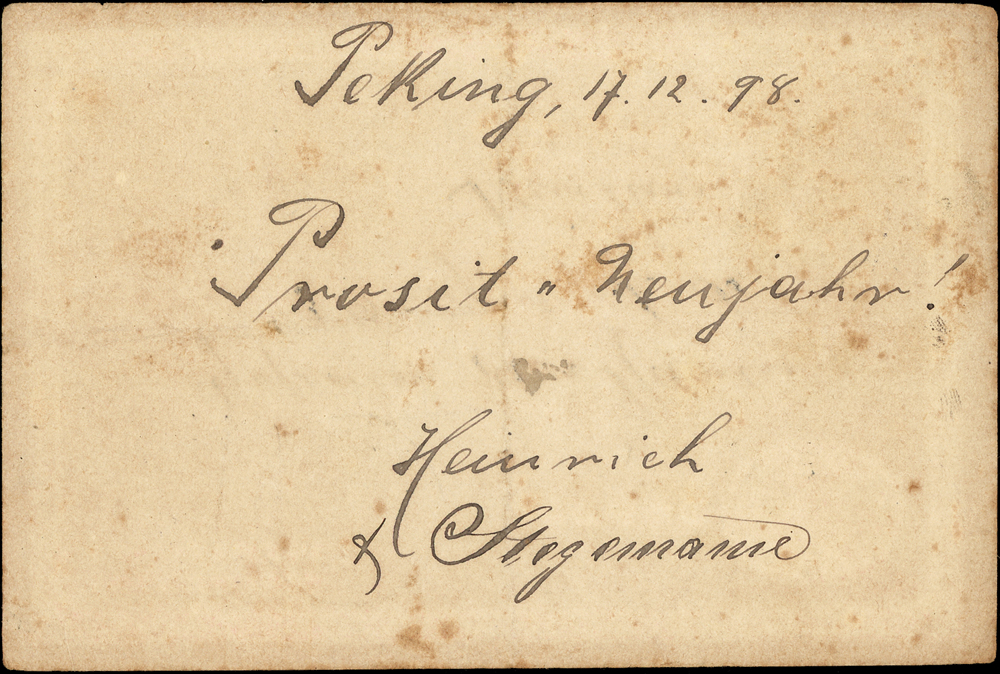 清一次片,1898年北京寄青島,銷北京18.DEC.98大圓戳,經上海24.DEC.98大圓戳,青島29/12.98德國客郵到戳,收件方為停靠膠州灣的德國海軍第三營SMS Kaiser Augusta軍艦,片中折泛黃 源流:郵史研究第28期『膠州郵史續探』第15頁原件,2011.3海峽兩岸郵史研究會出版(Page 7)