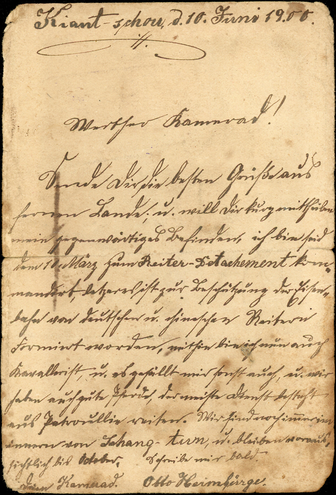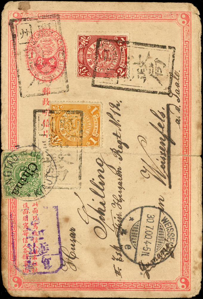 清一次片,加貼蟠龍1分及2分各一枚,銷『膠州/郵政局』碑型戳,旁另銷『青島/郵政局』碑型戳,加貼德國客郵加蓋China一枚,銷19/6.00青島德國客郵戳,德國30.7.00到戳,片中折約20mm裂痕,略舊;青島及膠州碑型戳首年使用例 源流:郵史研究第28期『膠州郵史續探』第20頁原件,2011.4海峽兩岸郵史研究會出版(Page 8)