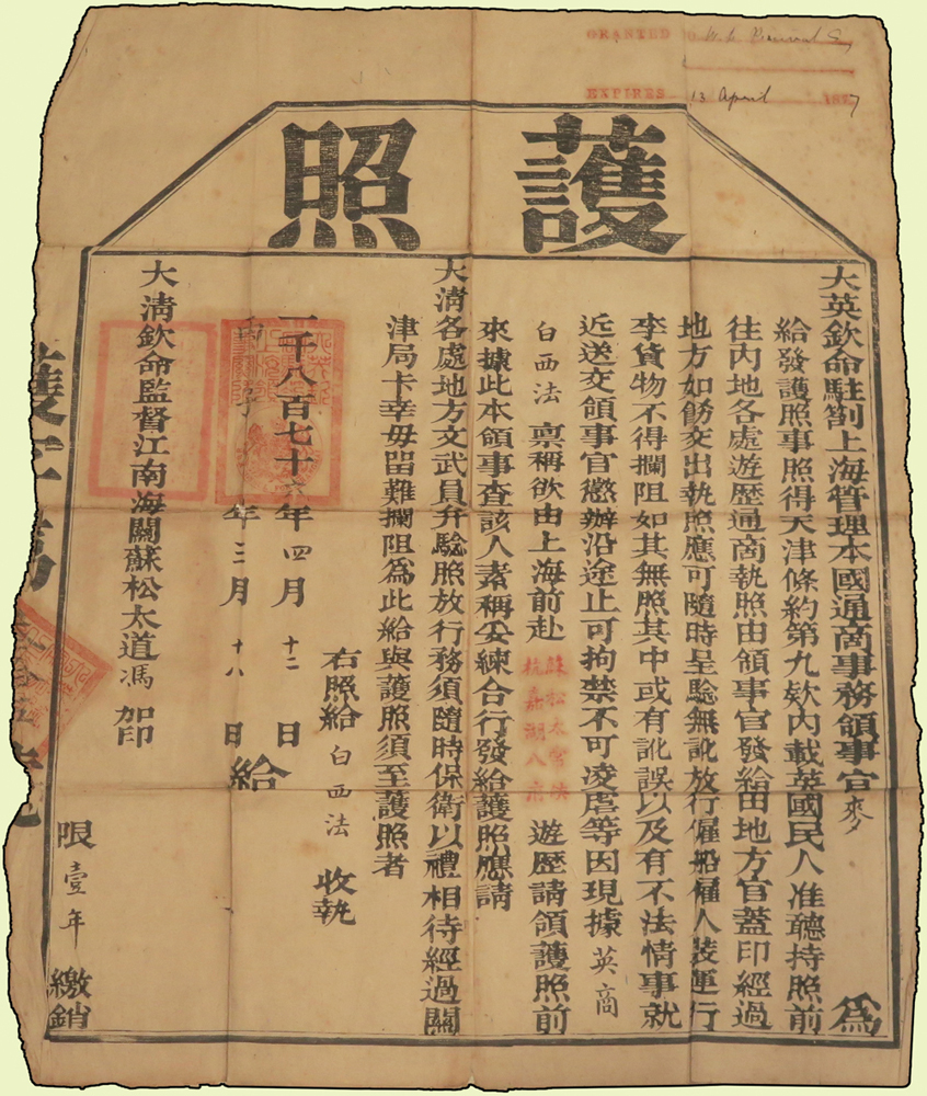 1876年(光緒2年)大清欽命監督江南海關蘇松太道,發給英國人由上海前往『蘇、松、太、常、鎮、杭、嘉、胡』等八府通商或遊歷《護照》(41.8*53cm)一件,有效期1年,清晰,蓋有紅色關防,數折,左側邊微損,中折處二處小破孔,無修補(Page 10)