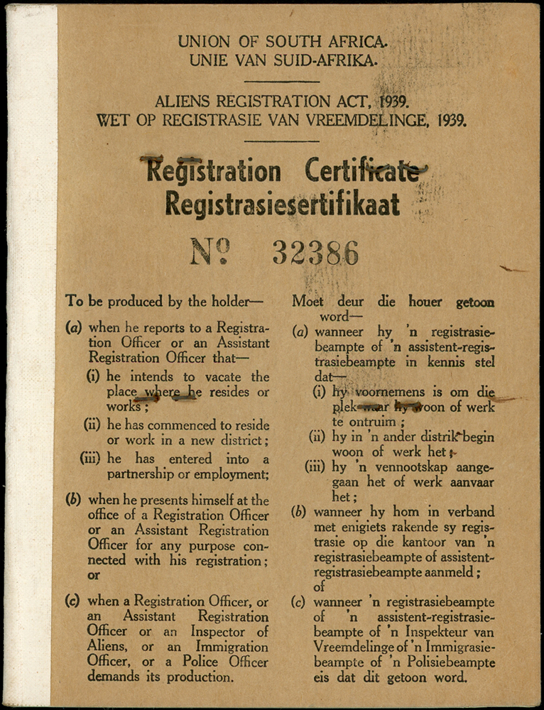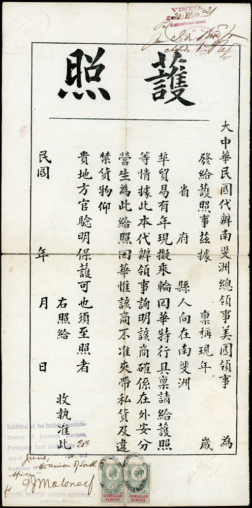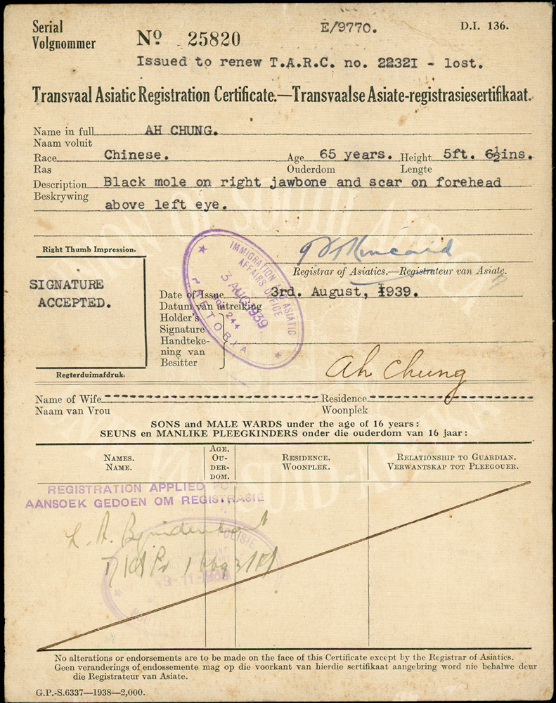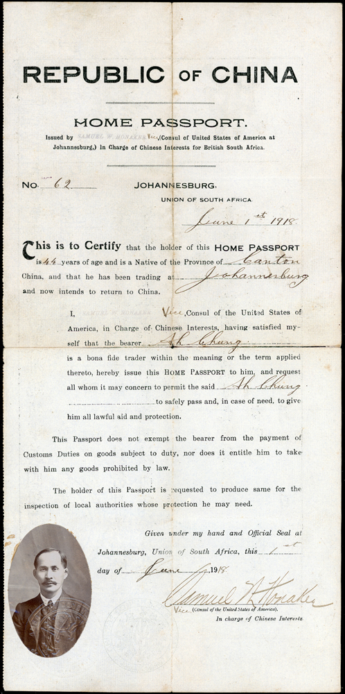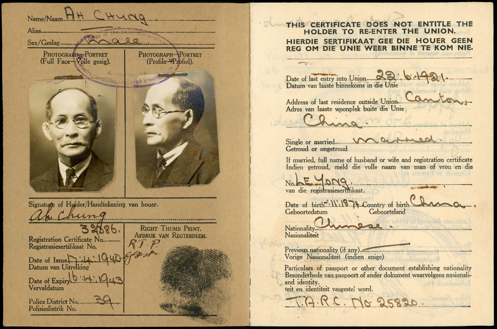 英屬南非聯邦申請入籍華人(AH CHUNG)居留登記證二件,護照(40*19.6cm)一件,均貼有相片銷印,其中護照十字折,中折處斷開1/2,保存尚佳,清晰 註:1911~1919年英屬南非聯邦僑務委由美國領事館代辦,此護照於1918年核發,背面記載著曾入境葡屬東非(現莫三比克)及德領事館檢查准入日期等;另居留登記證為實施種族隔離制度(1910-1994)期間1939年由川斯瓦省發給華人持用,內記載著搬遷.職業更換等相關事宜(Page 10)