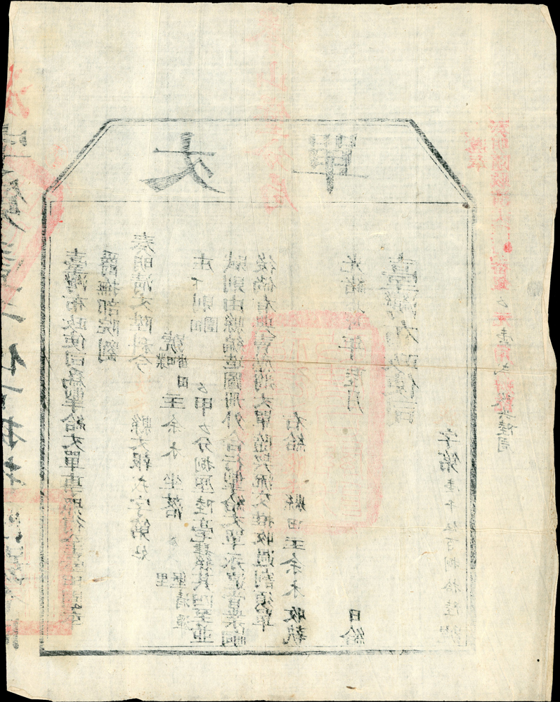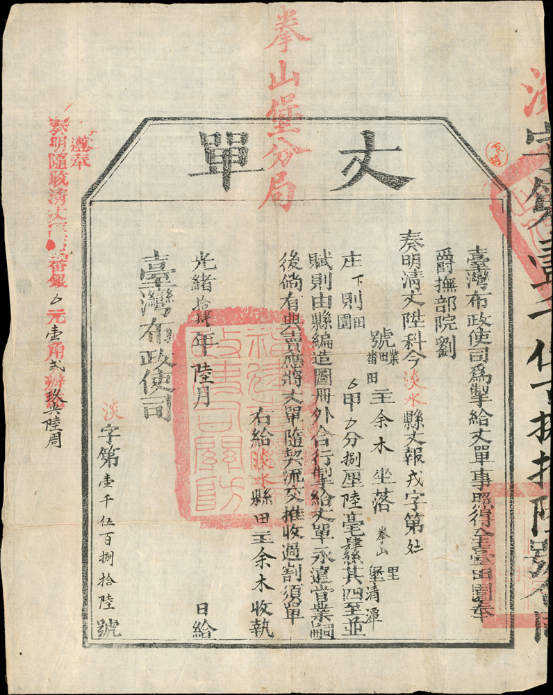 清代臺灣文獻:(1888年)光緒14年臺灣布政使司淡水縣拳山里清潭庄《丈單》(31.5*25cm)一件,完整清晰,蓋紅色『拳山堡分局』『福建臺灣府政使司關防』,摺痕,85新 註1:丈單即土地所有權狀,也做為收糧的依據,丈單有兩種,一種是佃戶將土地墾成後,業主清丈土地,給發佃人之單據,以定佃戶所應繳納之租穀;另一種是光緒年間劉銘傳進行清賦事業,清丈土地後發給業主的土地單據,主要作為政府課稅之依據,此種丈單在土地買賣時要併同移轉 註2:1875年臺北府淡水縣拳山堡,1894年拳山堡更名為文山堡,日治時期1895年隸屬臺北縣文山堡,1909年改隸臺北廳新店支廳,此地現為新店區青潭一帶(Page 11)