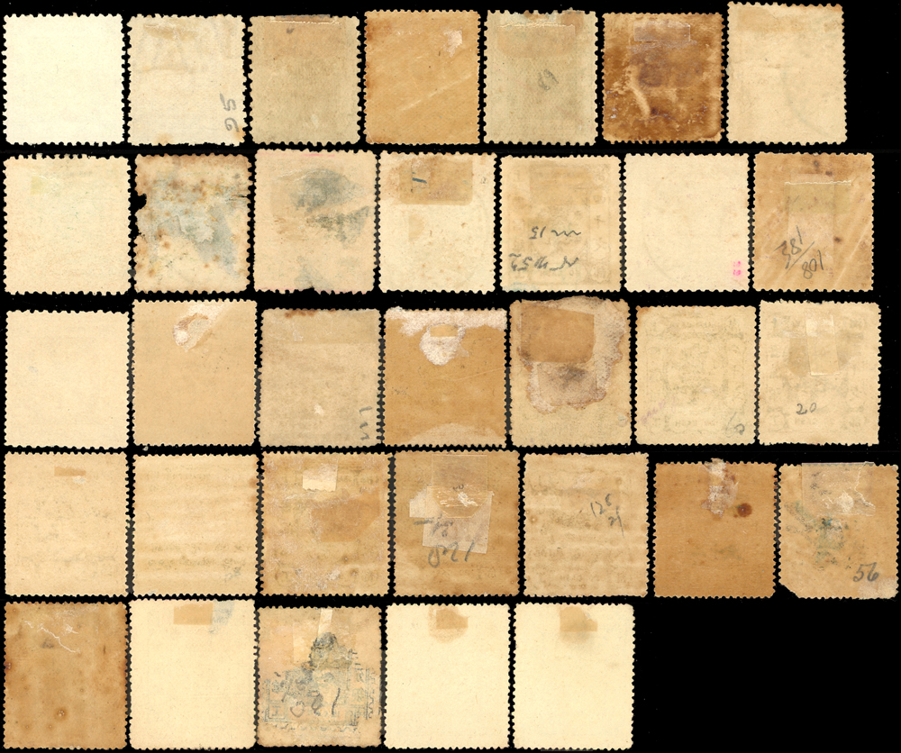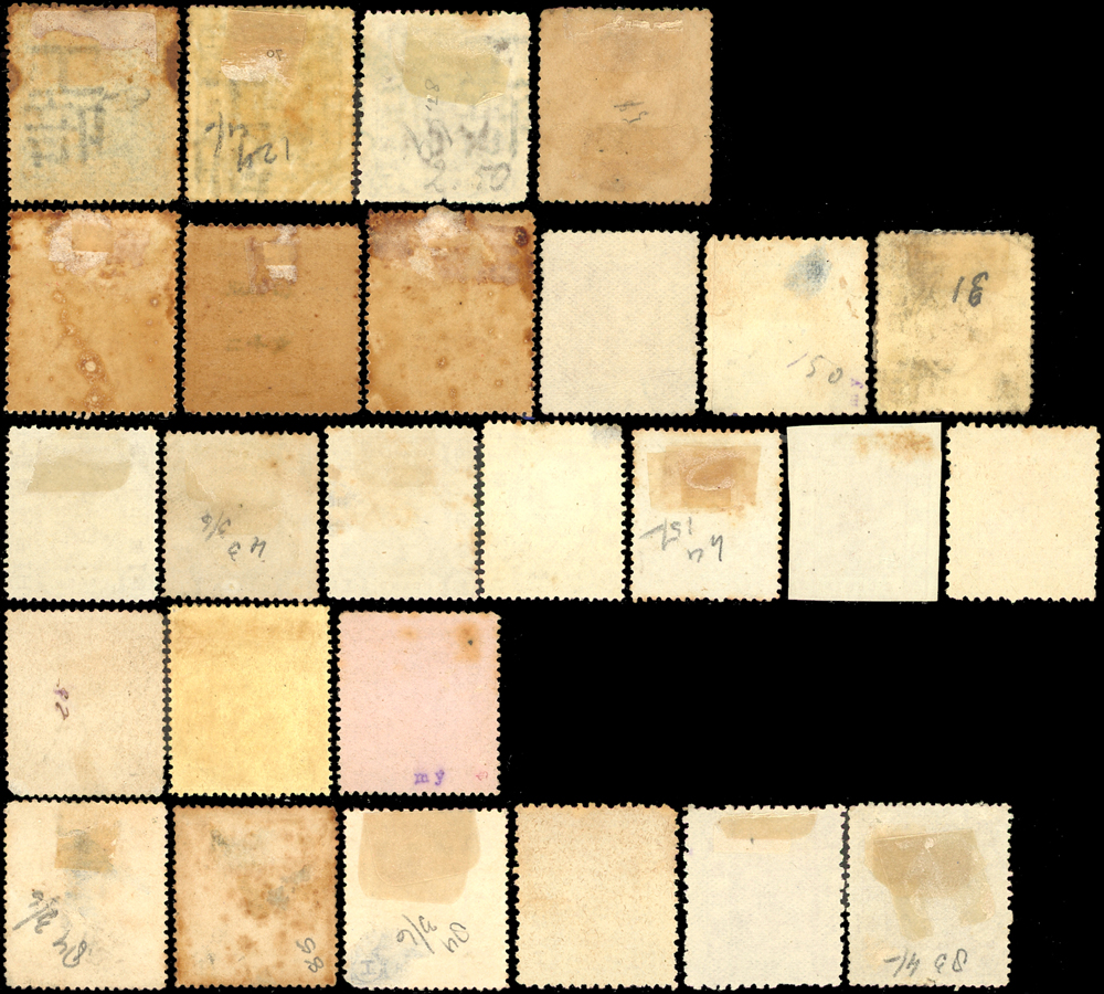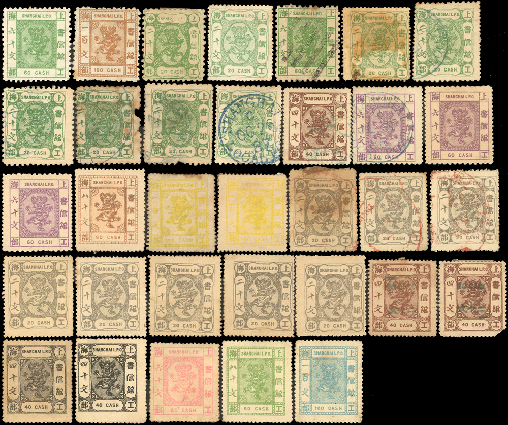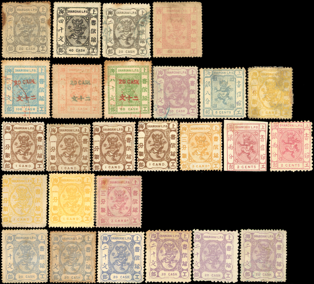 上海工部小龍新舊票混和一組共59枚,含:新票39枚,舊票20枚,包括:第一次版銀兩分有.無齒新票各1枚,第二次版一分銀.三分銀新票,第四次版一分銀.三分銀新票,制錢面值票二十文.四十文.六十文.八十文.一百十文,制錢加蓋改值票橫蓋二十文等,品像混合或有重複,部分背貼,F-VF;歡迎至官網瀏覽全貌(Page 12)