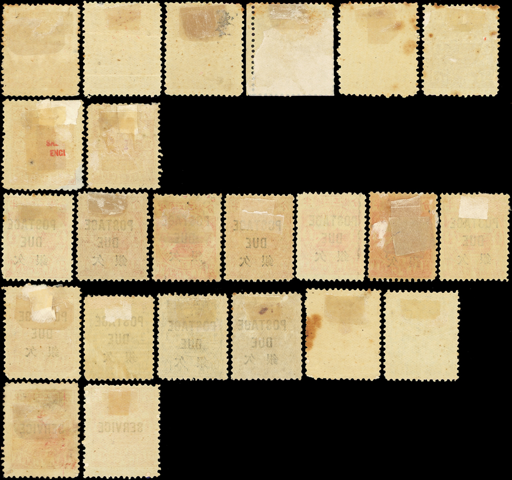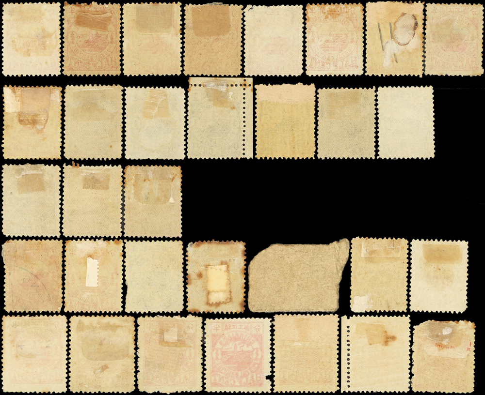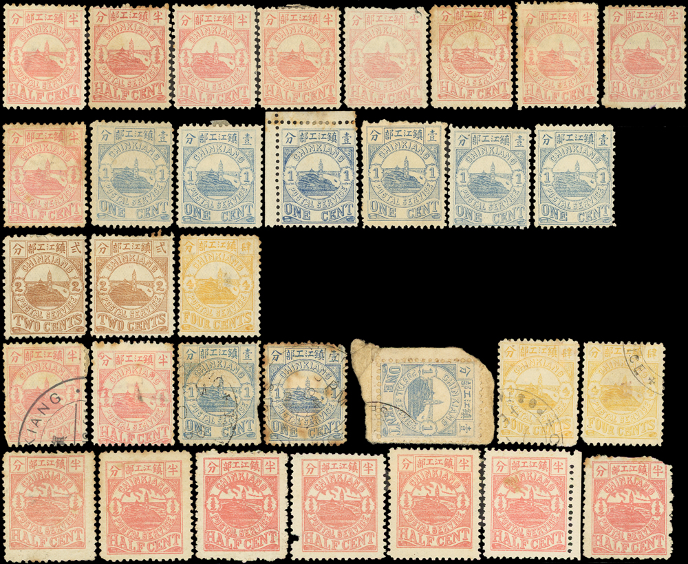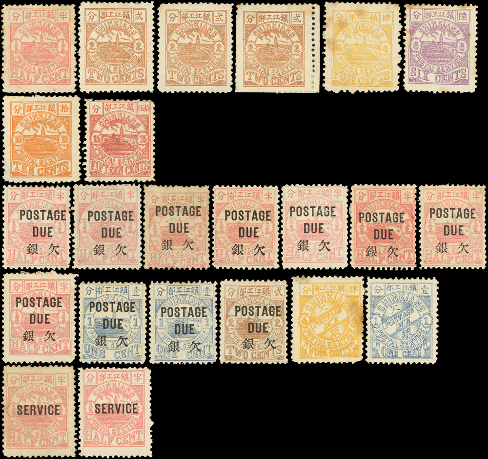 1894~1896年鎮江書信館郵票一組共55枚,含新票48枚,舊票7枚,包括:第一次版半分~4分,第二次版半分~15分,加蓋欠資半分~2分,石印欠資1分.4分各1枚,公文用票半分2枚等,品像混合或有重複,背貼,VF-F;歡迎至官網瀏覽全貌(Page 12)