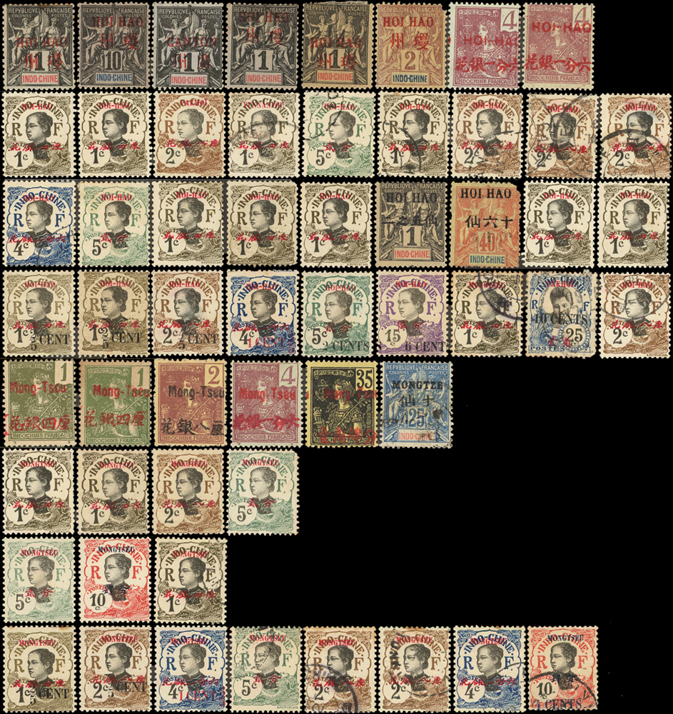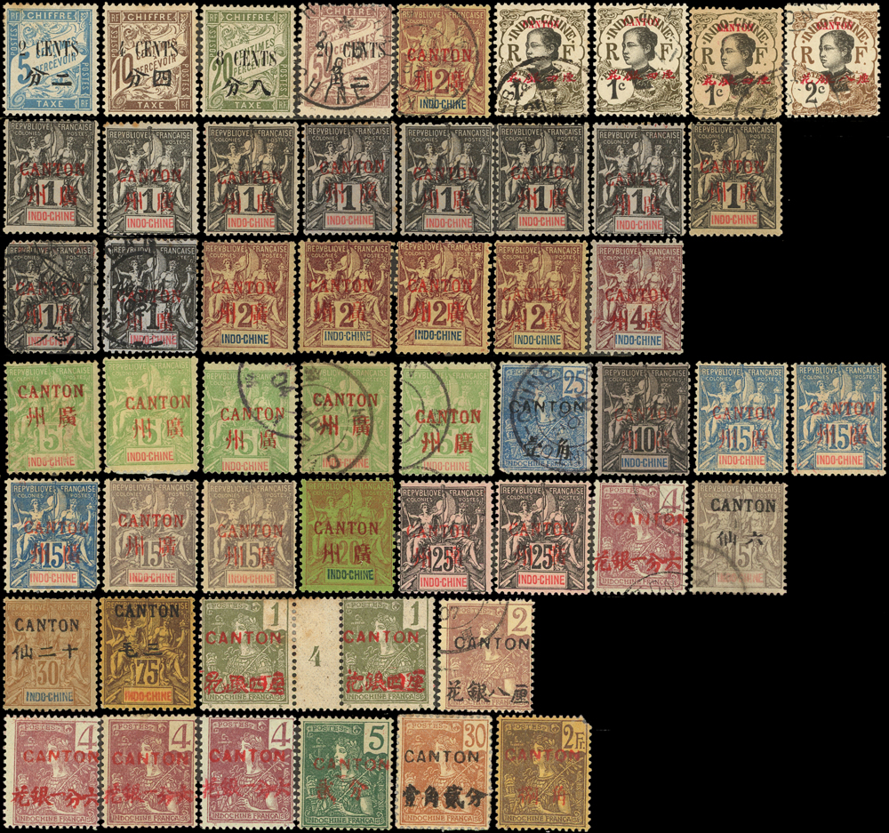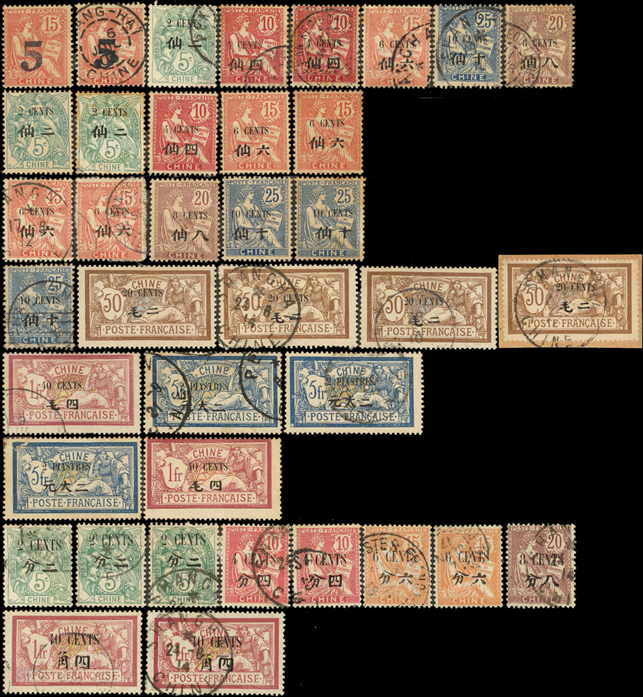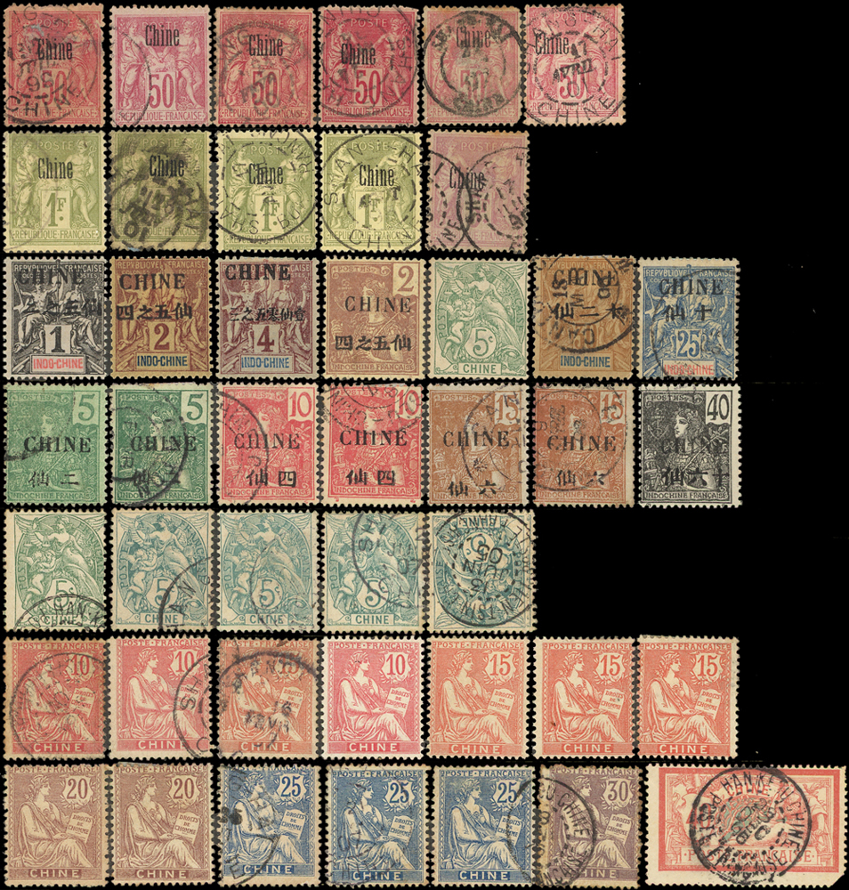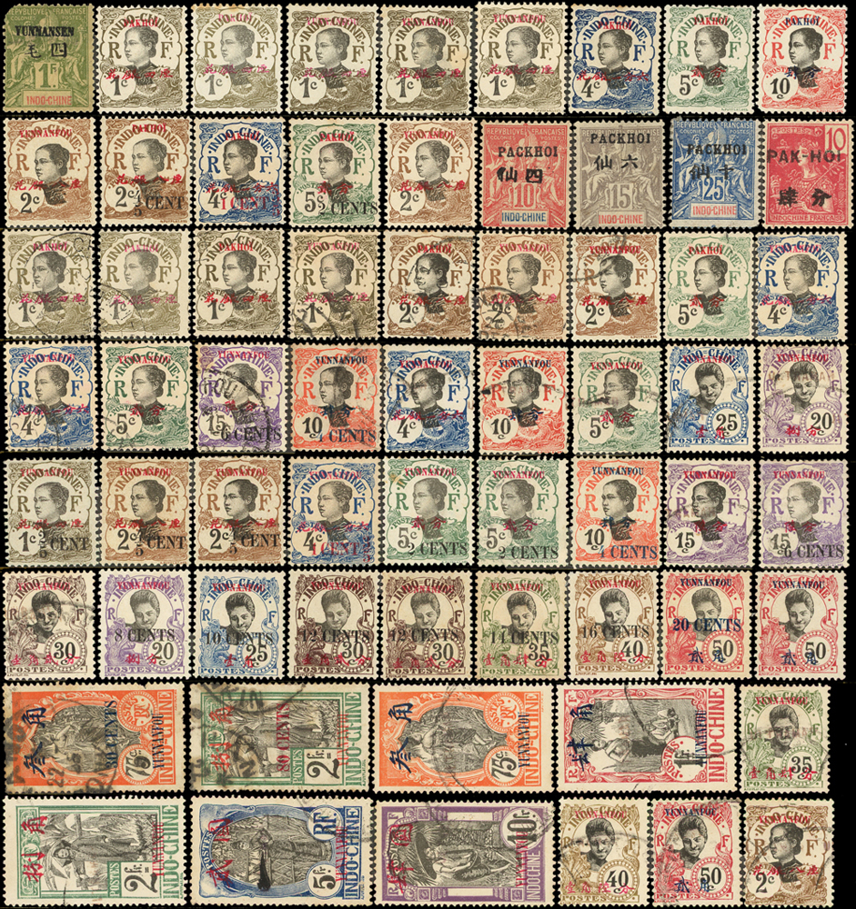1894~1919年法國在華客郵及法屬安南在華客郵一組共584枚,含新票301枚,舊票283枚,有:和平與商務神像圖加蓋CHINE,普通票,普通票加蓋大.小字面值,欠資票加蓋中國幣值,安南航海與商務神像圖加蓋CANTON廣州,安南婦女圖加蓋CANTON及中國面值,安南景物圖加蓋KOUANG-TCHEOU等等,品像混合或有重複,VF-F;歡迎至官網瀏覽全貌(Page 14)