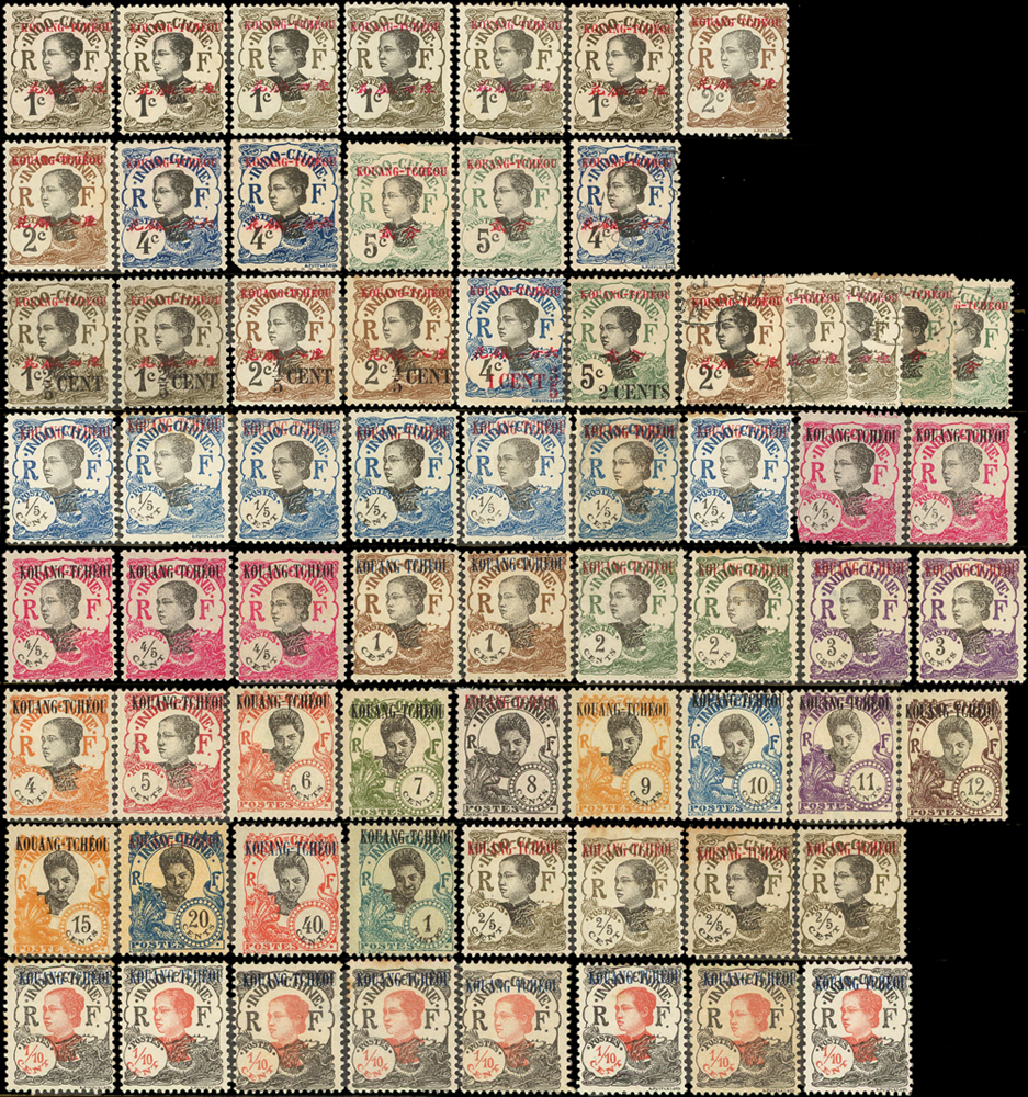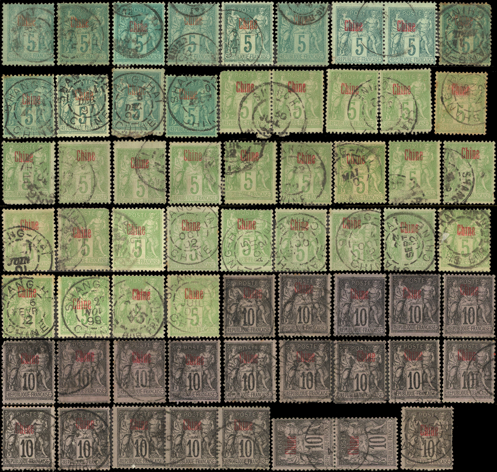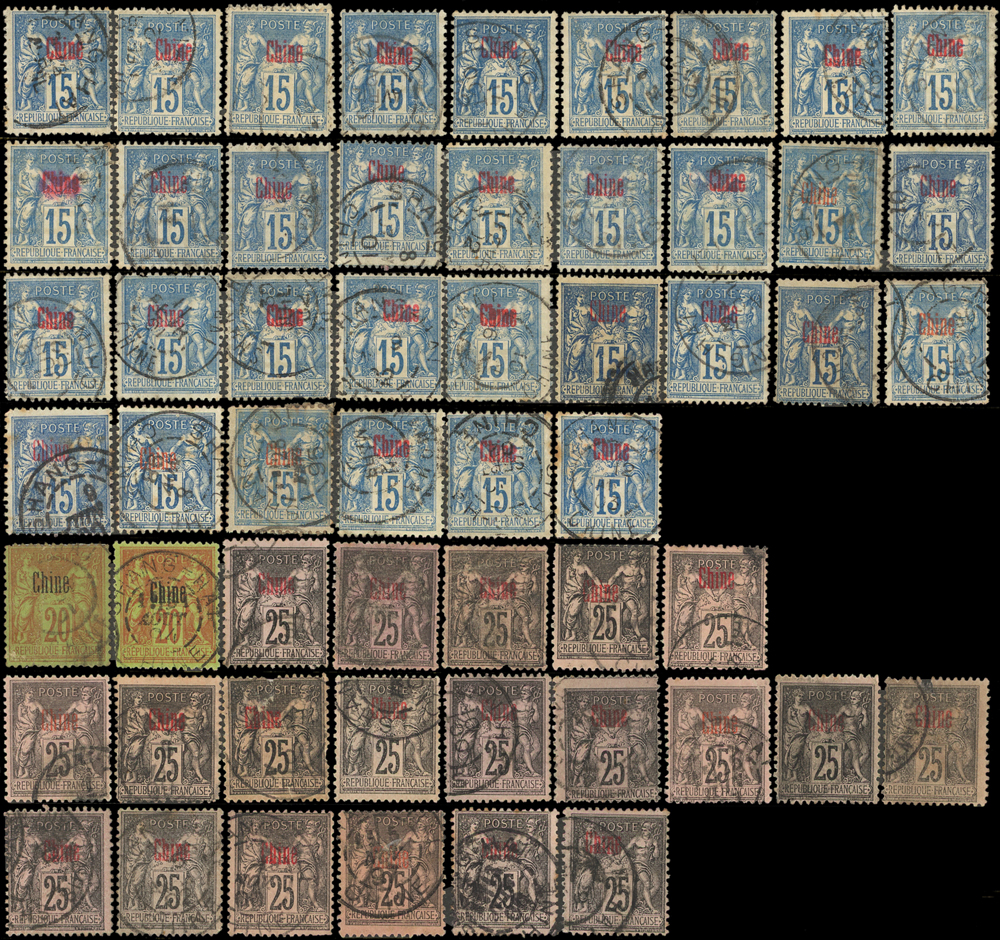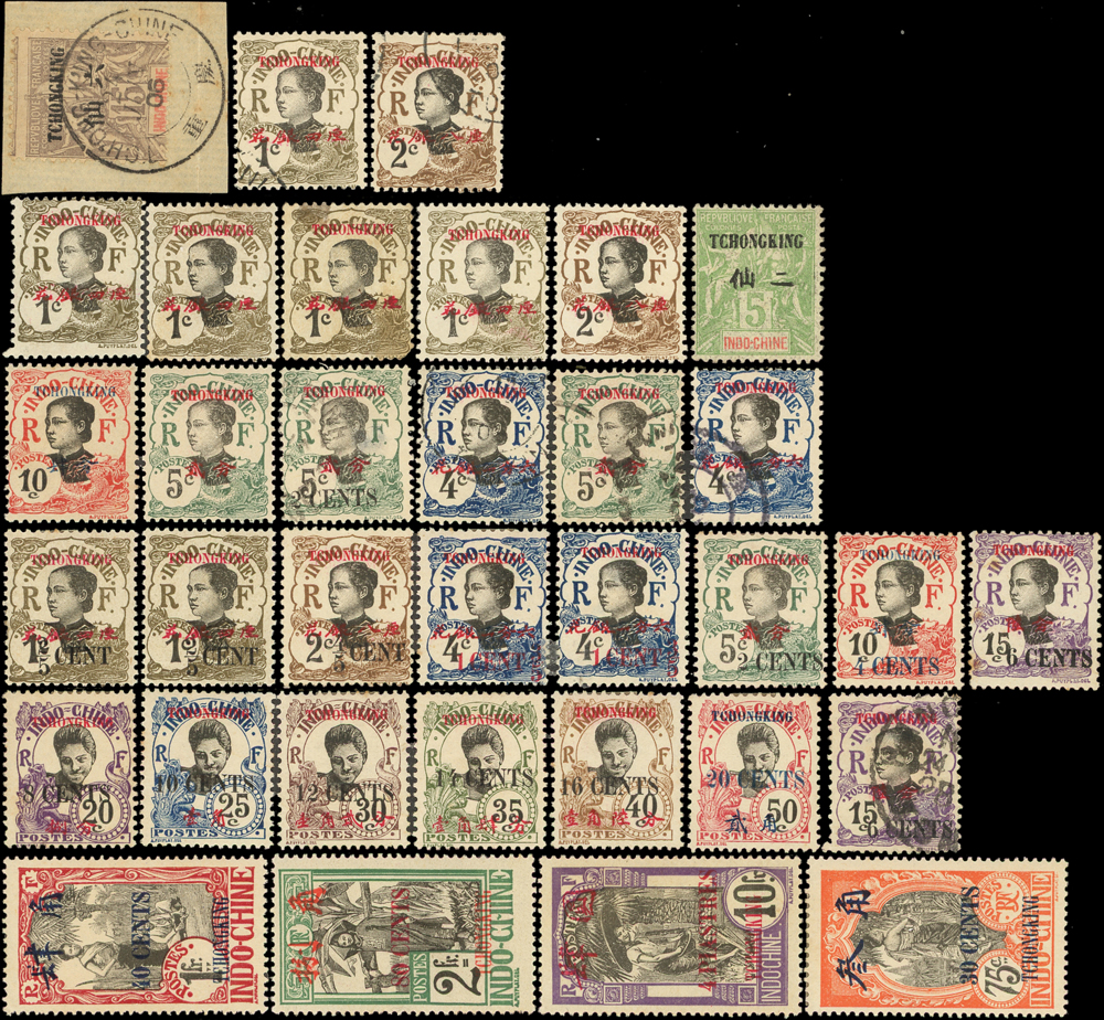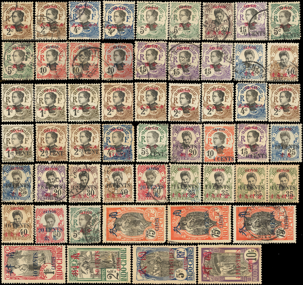 1894~1919年法國在華客郵及法屬安南在華客郵一組共584枚,含新票301枚,舊票283枚,有:和平與商務神像圖加蓋CHINE,普通票,普通票加蓋大.小字面值,欠資票加蓋中國幣值,安南航海與商務神像圖加蓋CANTON廣州,安南婦女圖加蓋CANTON及中國面值,安南景物圖加蓋KOUANG-TCHEOU等等,品像混合或有重複,VF-F;歡迎至官網瀏覽全貌(Page 14)