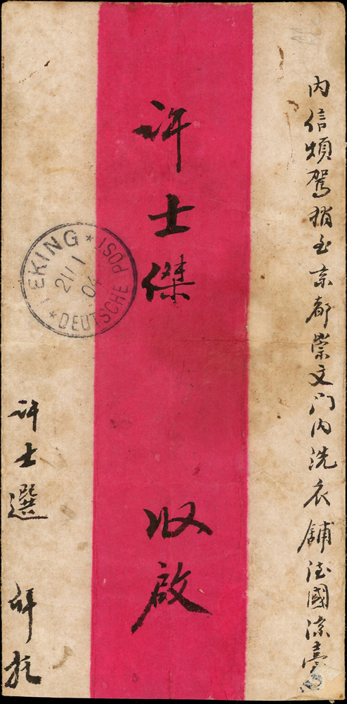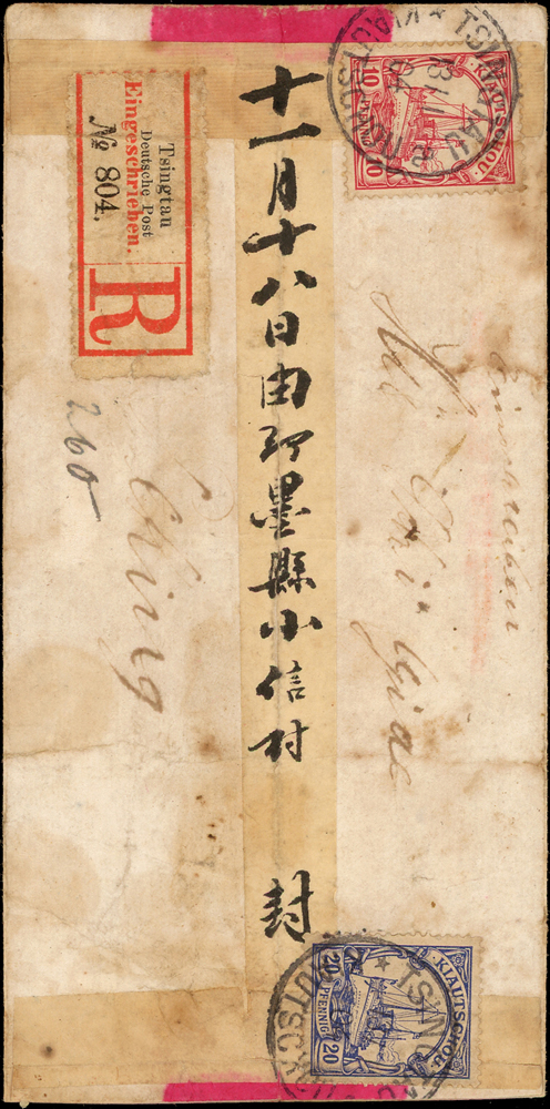 1904年青島寄北京中式紅條掛號封,背貼膠州德國10芬尼吉20芬尼客郵各一枚,銷13/1.04青島客郵戳,北京21/1.04德國客郵到戳 源流:郵史研究第28期『膠州郵史續探』第19頁原件,2011.4海峽兩岸郵史研究會出版(Page 15)