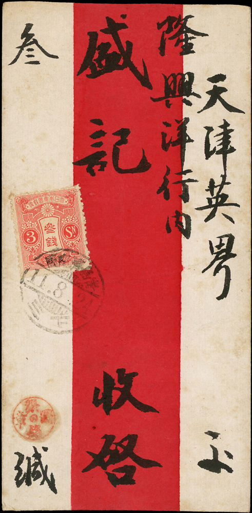 山東鐵道:1922年青島寄天津中式紅條火車封,貼日郵加蓋支那3錢1枚,銷『青島濟南間/11.8.24/下三』櫛型火車戳,非常晚期使用 註:此戳使用時間:1914年(大正2年)11月29日至1922年(大正11年)12月10日(Page 15)