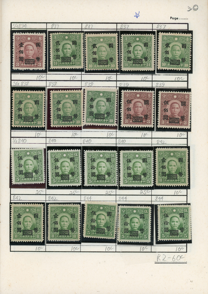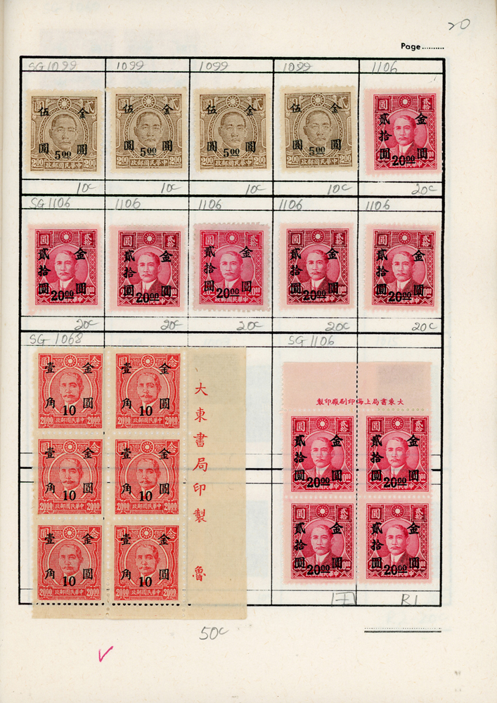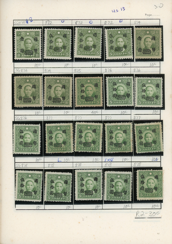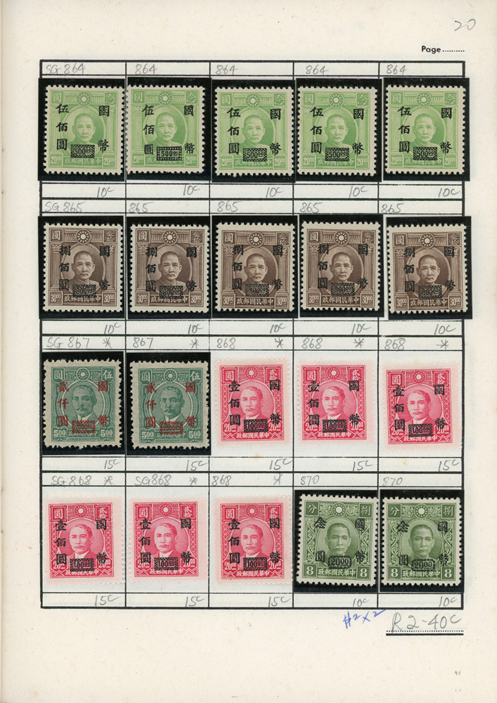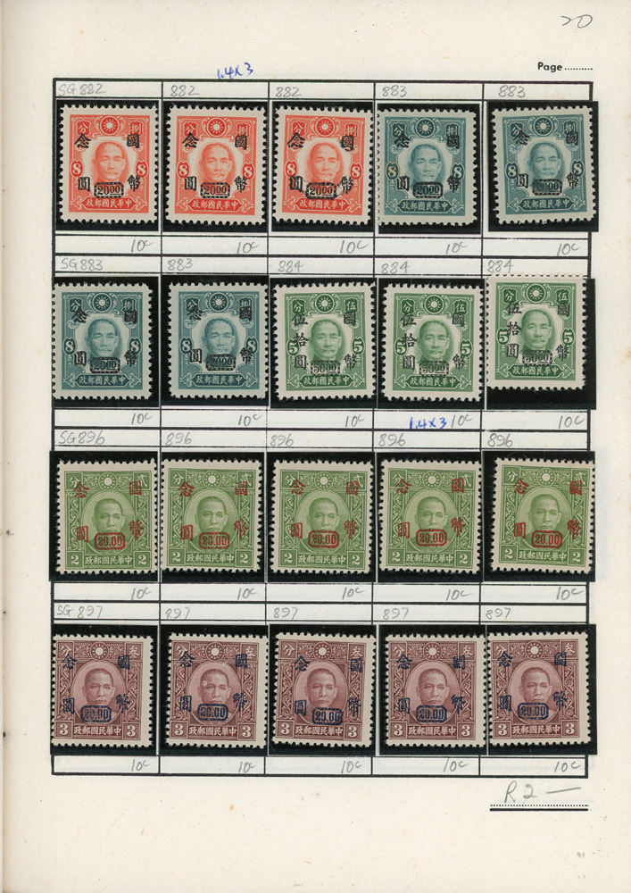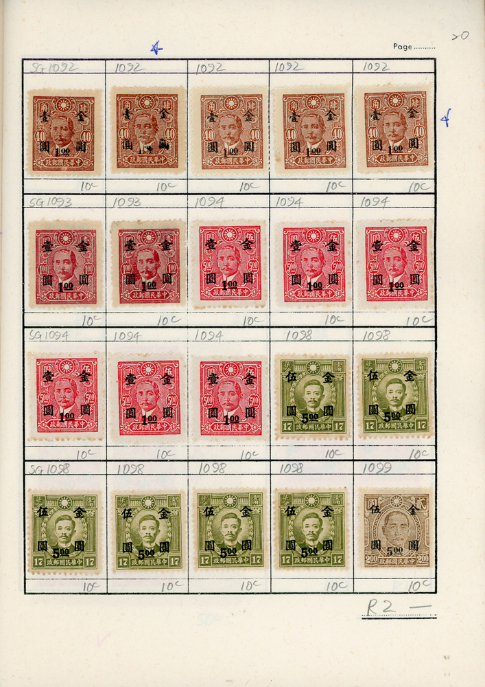 各版國父像先烈像不成套新票約1370枚,品種豐富,含:國父像烈士像改值金圓.國父北平中央二版限東北.國父像改高額國幣.國父像偽新民版東北改值.國父像烈士像改值國幣.國父像香港大東版.香港商務版烈士像.國父像上海大東二版.國父像百城二版等,品像混合或有重複,部分貼於紙上,VF-F,歡迎至官網瀏覽全貌(Page 17)
