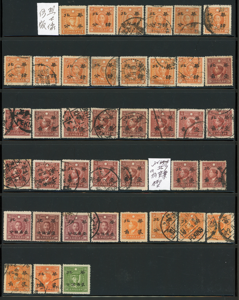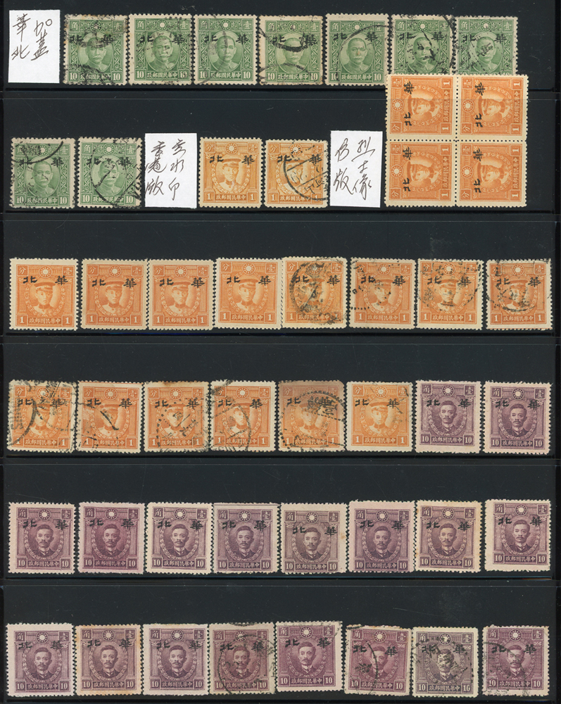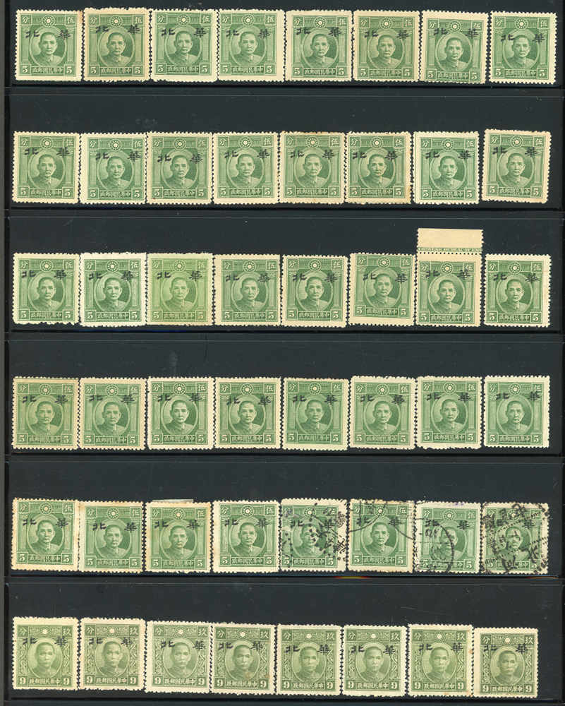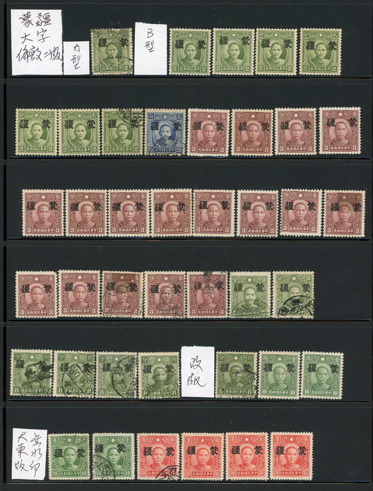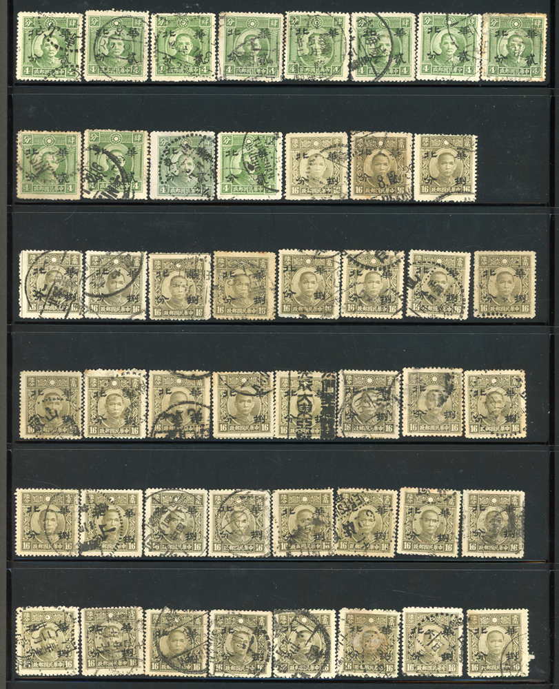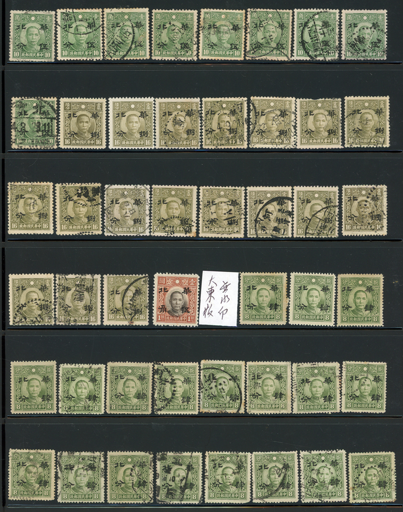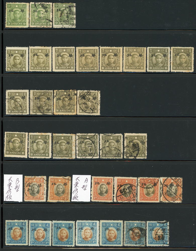淪陷區郵票新.舊混和一組共1558枚,整理整齊於黑卡中,包括:新票715枚.舊票843枚,含:華北六區加蓋票-河北.山西.山東.河南,蒙疆大.小字,蒙疆加蓋半值票,仿版加蓋蒙疆,蒙疆加蓋改值,加蓋華北,新嘉坡陷落-河北.河南.山東.山西等等,品像混合或有重複,VF-F,歡迎至官網瀏覽全貌(Page 19)