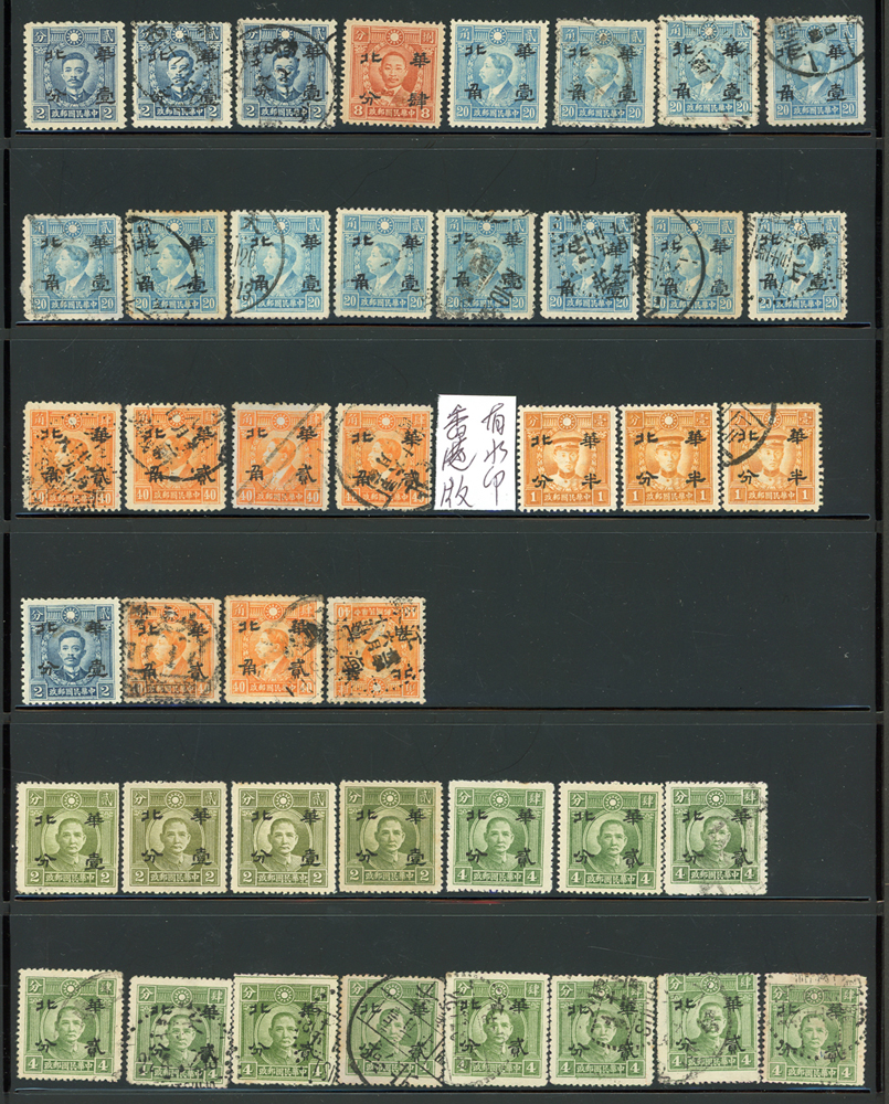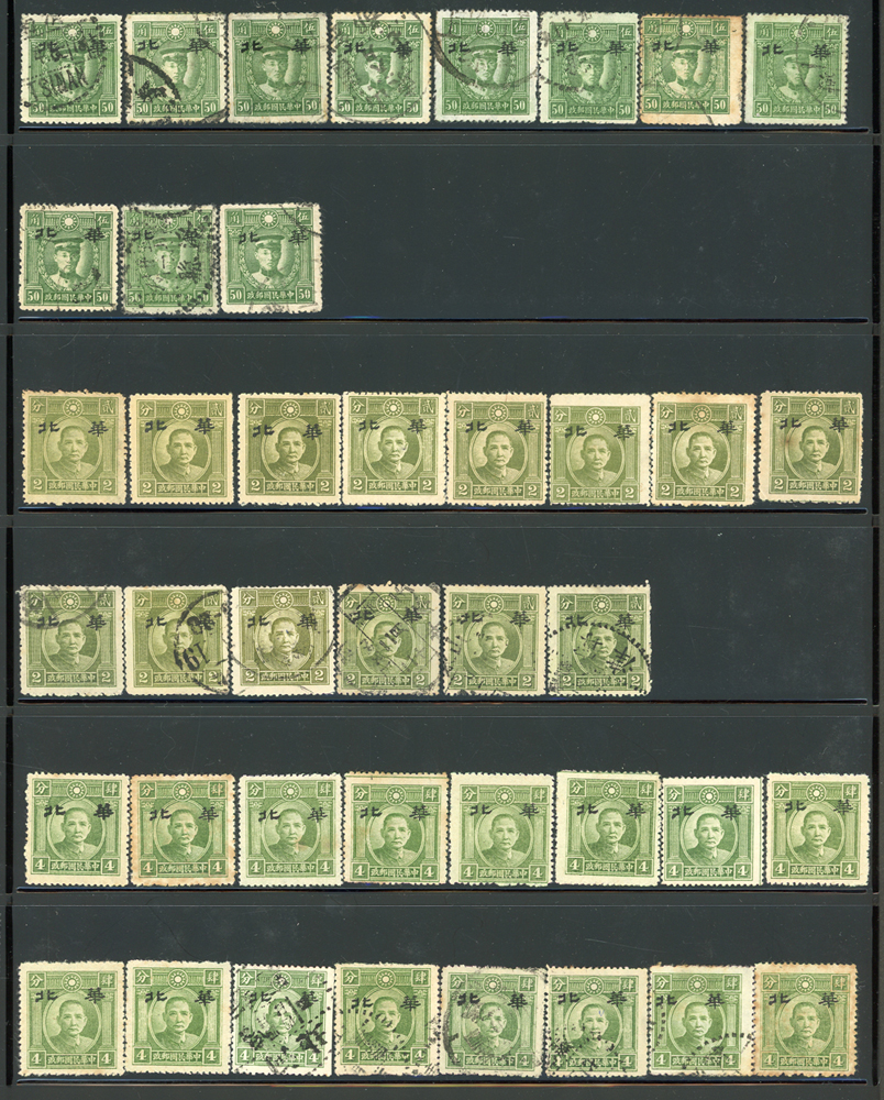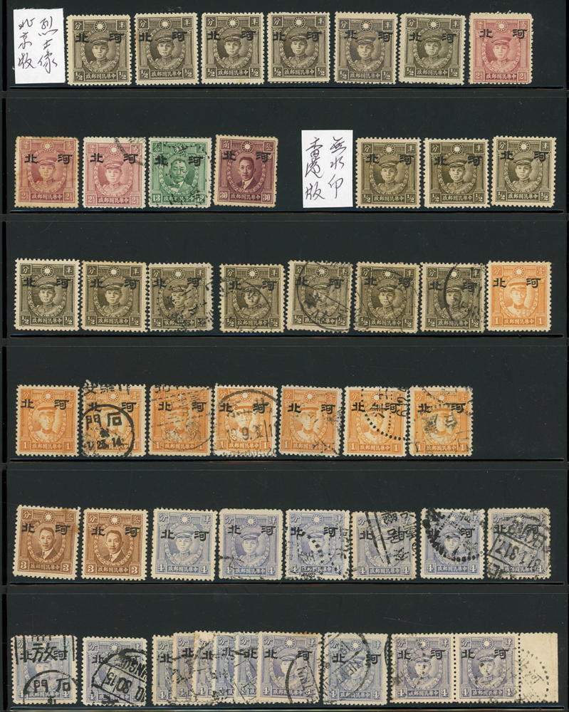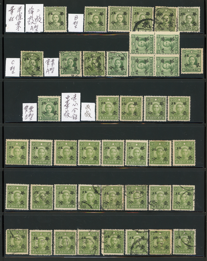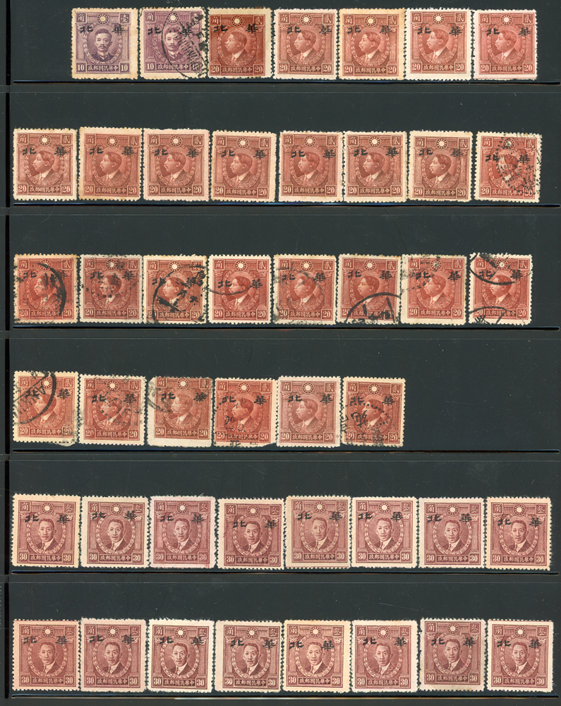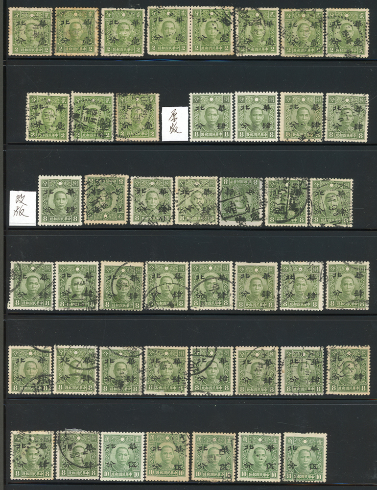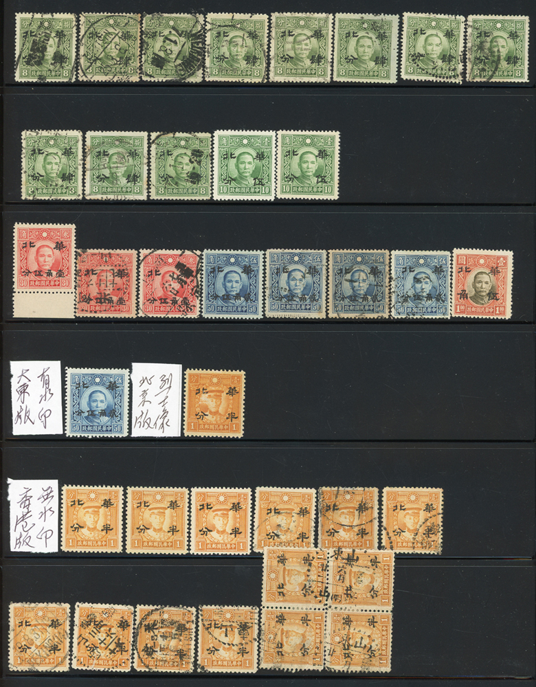 淪陷區郵票新.舊混和一組共1558枚,整理整齊於黑卡中,包括:新票715枚.舊票843枚,含:華北六區加蓋票-河北.山西.山東.河南,蒙疆大.小字,蒙疆加蓋半值票,仿版加蓋蒙疆,蒙疆加蓋改值,加蓋華北,新嘉坡陷落-河北.河南.山東.山西等等,品像混合或有重複,VF-F,歡迎至官網瀏覽全貌(Page 19)