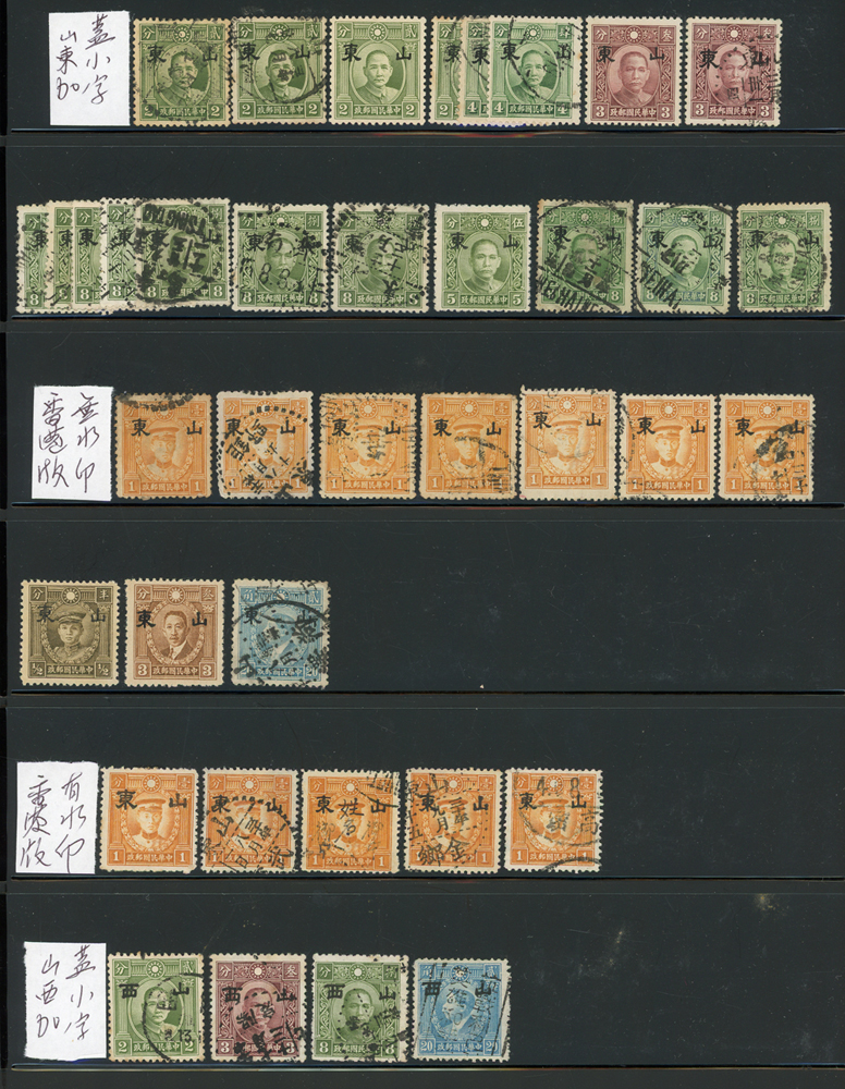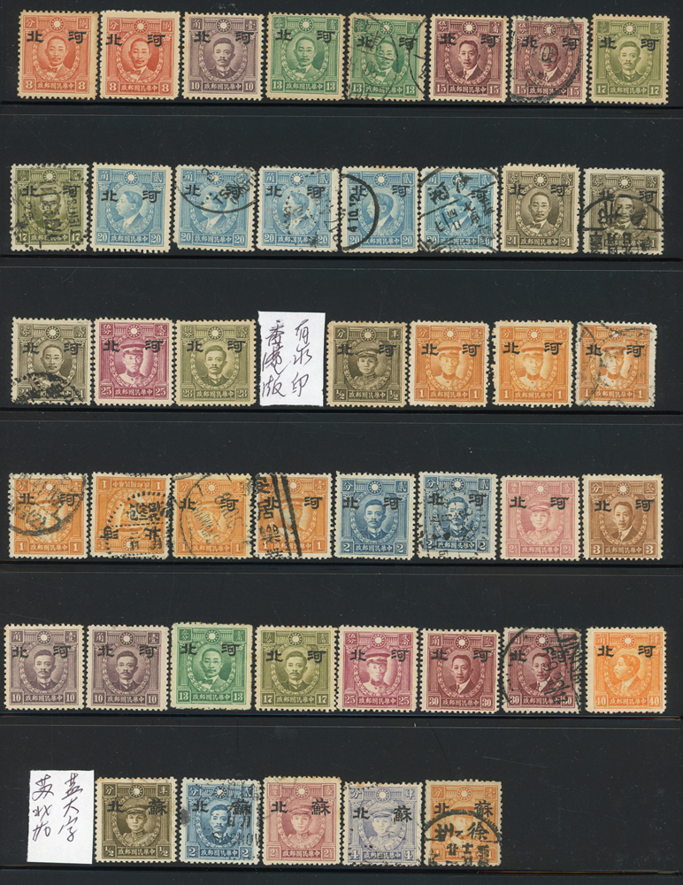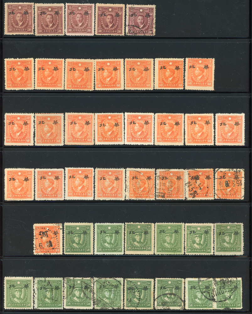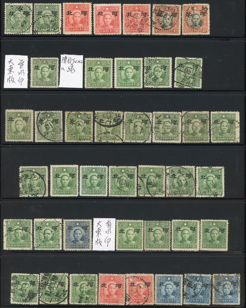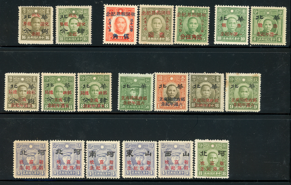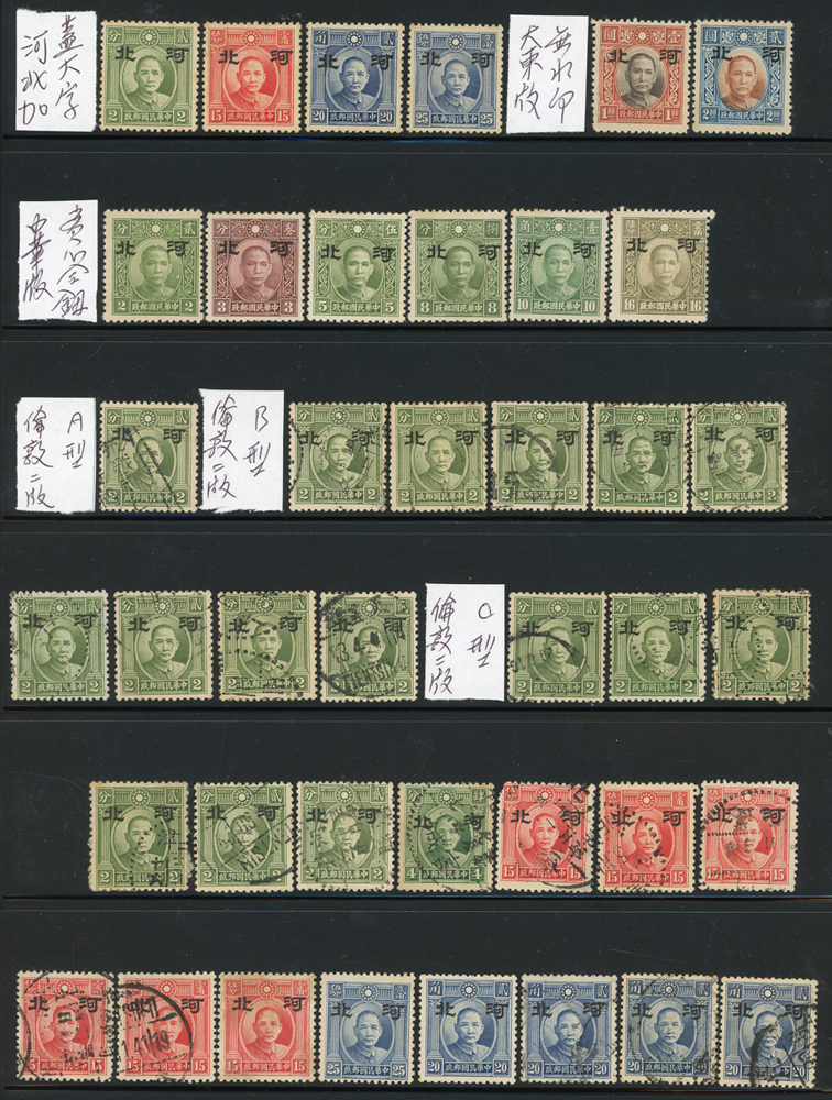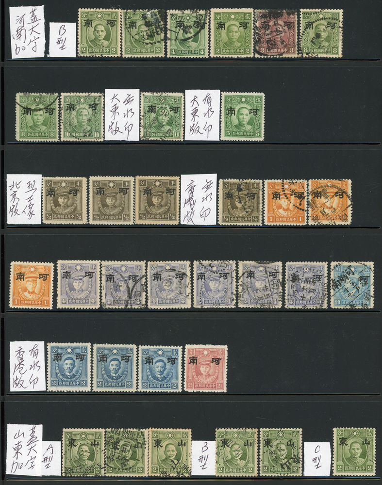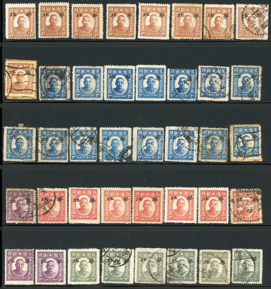 淪陷區郵票新.舊混和一組共1558枚,整理整齊於黑卡中,包括:新票715枚.舊票843枚,含:華北六區加蓋票-河北.山西.山東.河南,蒙疆大.小字,蒙疆加蓋半值票,仿版加蓋蒙疆,蒙疆加蓋改值,加蓋華北,新嘉坡陷落-河北.河南.山東.山西等等,品像混合或有重複,VF-F,歡迎至官網瀏覽全貌(Page 19)