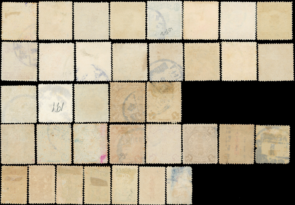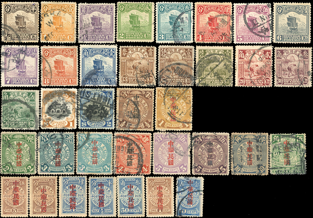 民國新舊郵票一組共36枚:(1)蟠龍加蓋宋字中華民國舊票半分~5角,共10枚,有重複,F-VF;(2)宋字加蓋中華民國欠資半分.1分.2分.4分.5分.3角新票各1枚,1角舊票1枚,VF-F;(3)北京一版帆船.農穫.辟雍舊票19枚,缺5元.10元.20元成套,F-VF(Page 19)