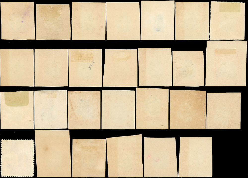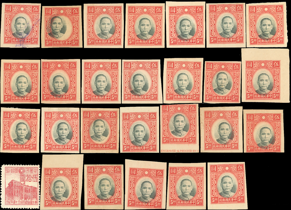 變體票27枚:(1)常27.國父像香港中華二版5元無齒未完成票新票25枚.舊票1枚,中心國父像均往下.往上.往左.往右移位變體,VF-F;(2)偽華北郵政成立七週年50元新票1枚,國徽修飾,VF-F(Page 20)