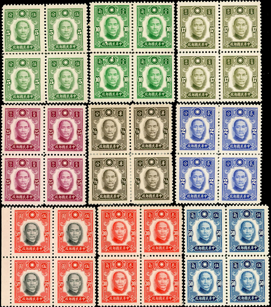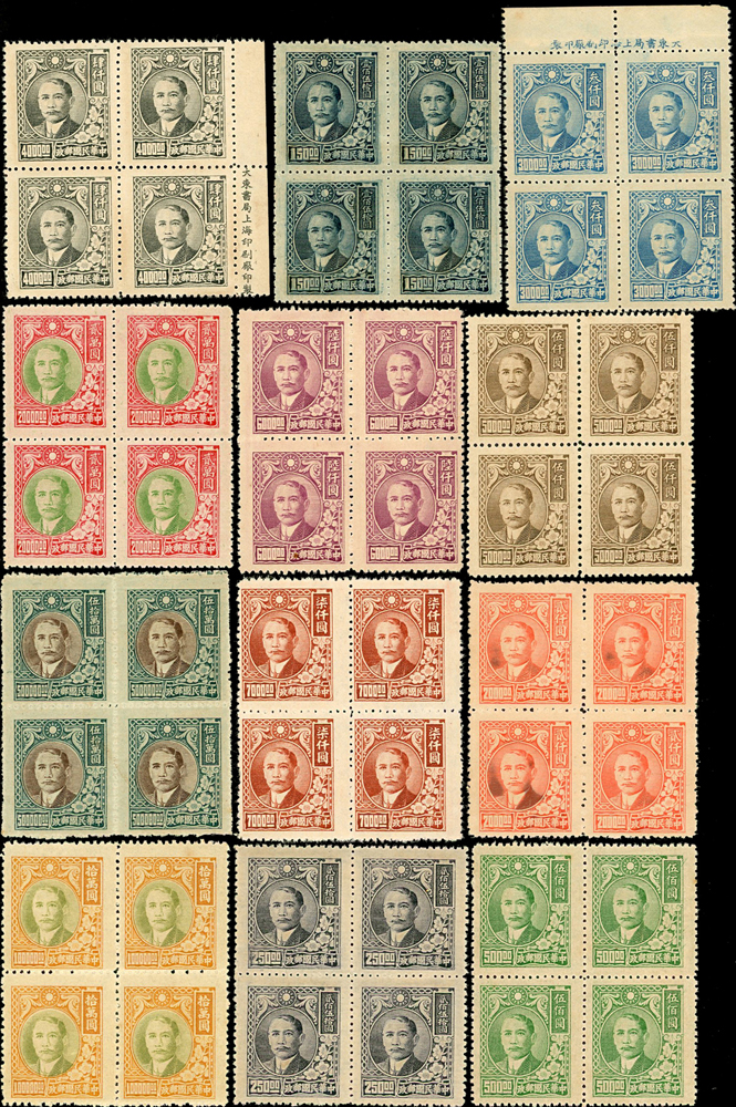 民國時期新票:(1)常33.國父像紐約版16全4方連,原膠背淡黃或1~2個淡斑點,半分下二枚背沾黏紙,5分橫中折處旁微皺痕,部分帶邊紙,VF-F;(2)常53.國父像上海大東二版17全4方連,淡黃,2000元微氧化局部黑斑,3000元及4000元帶廠銘,VF-F