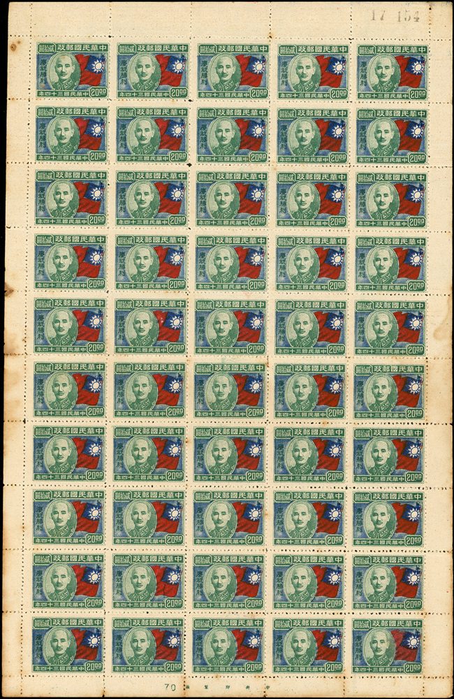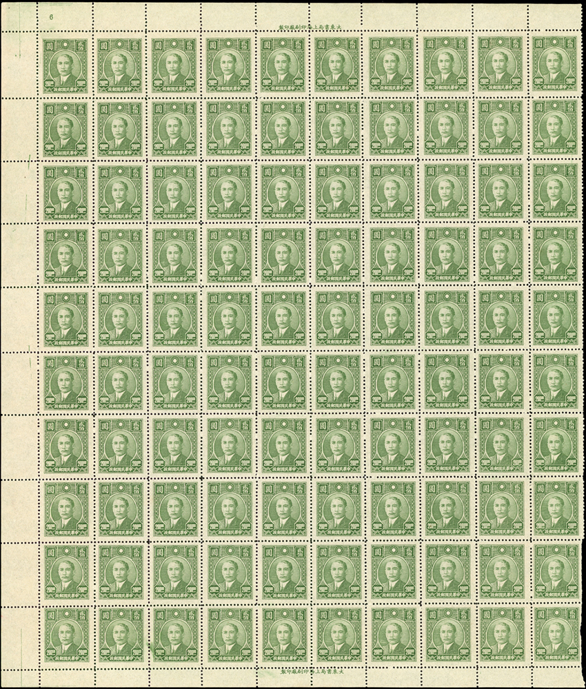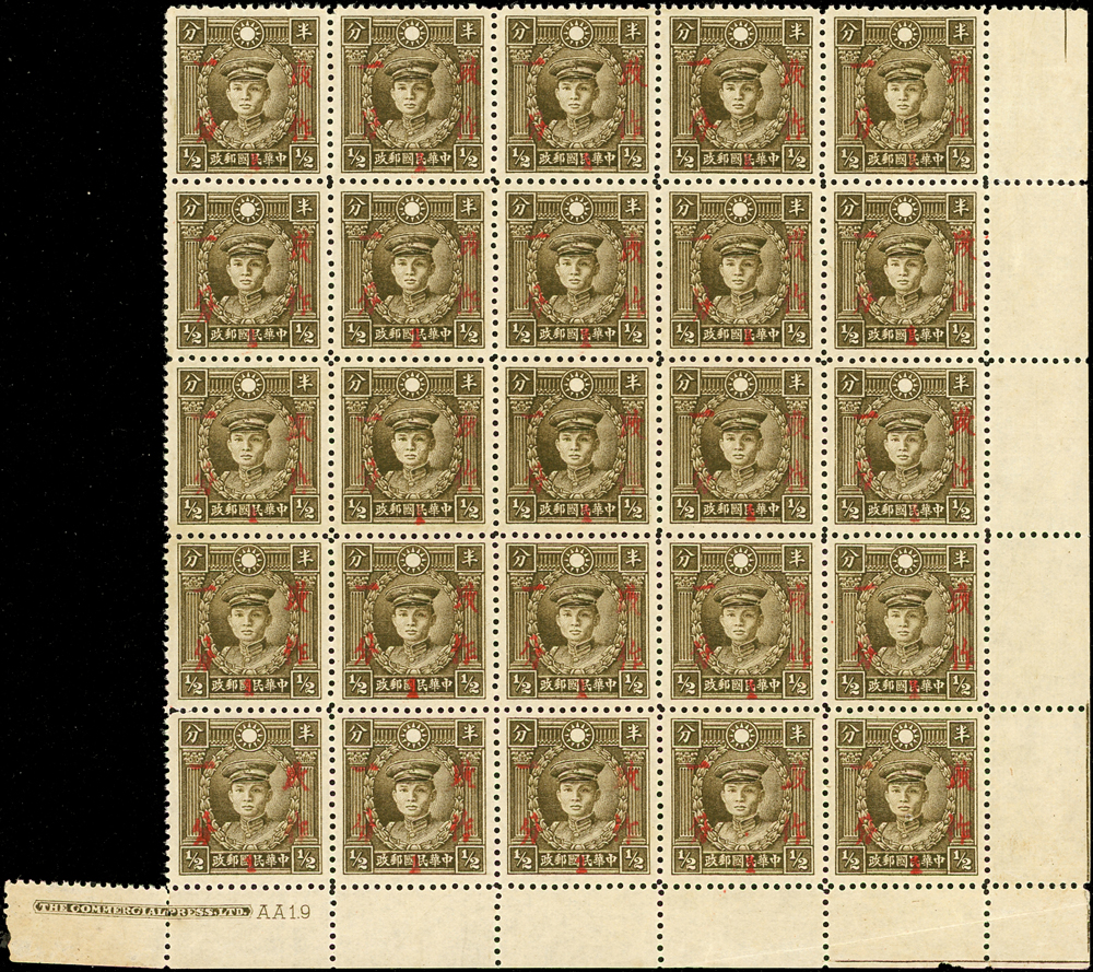 民國郵票:(1)國父像上海大東一版新票200元左半版100枚;(2)慶祝勝利紀念20元1版50枚,背黃斑;(3)國父像先烈像改作一分湘粵加蓋25(枚)方連,背淡黃;以上品像混合,F-VF;歡迎至官網瀏覽全貌(Page 26)