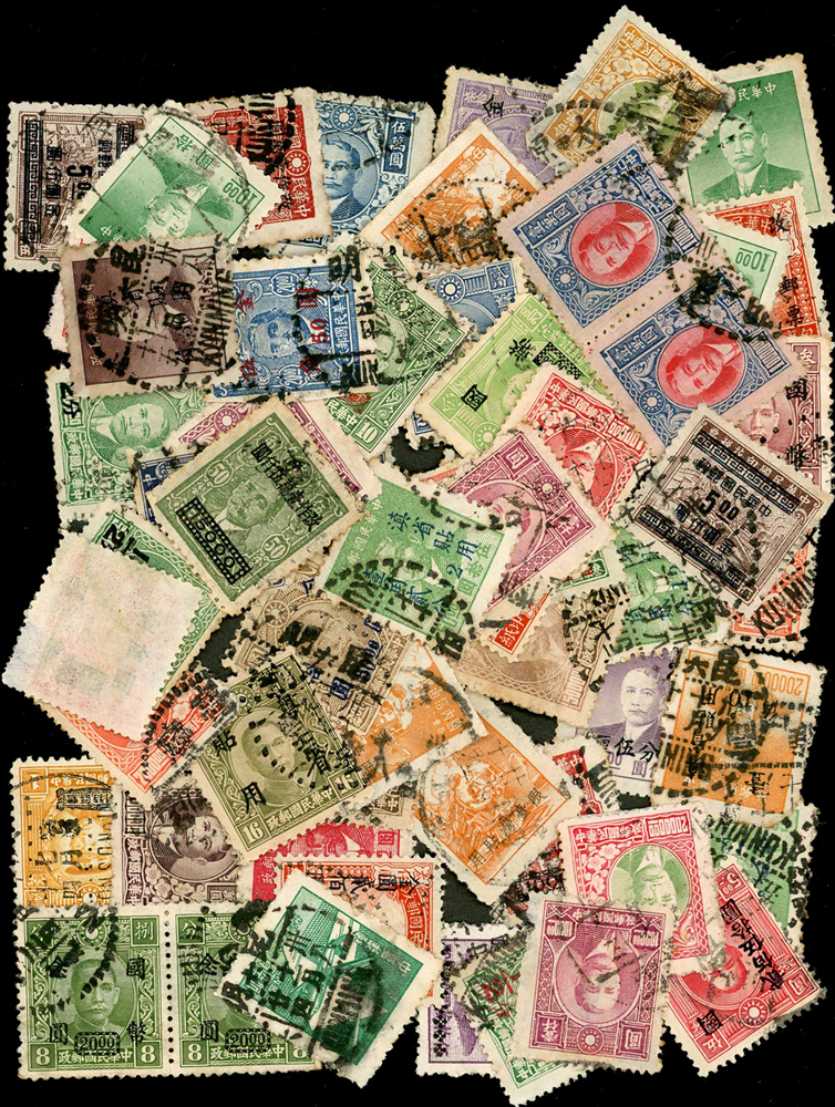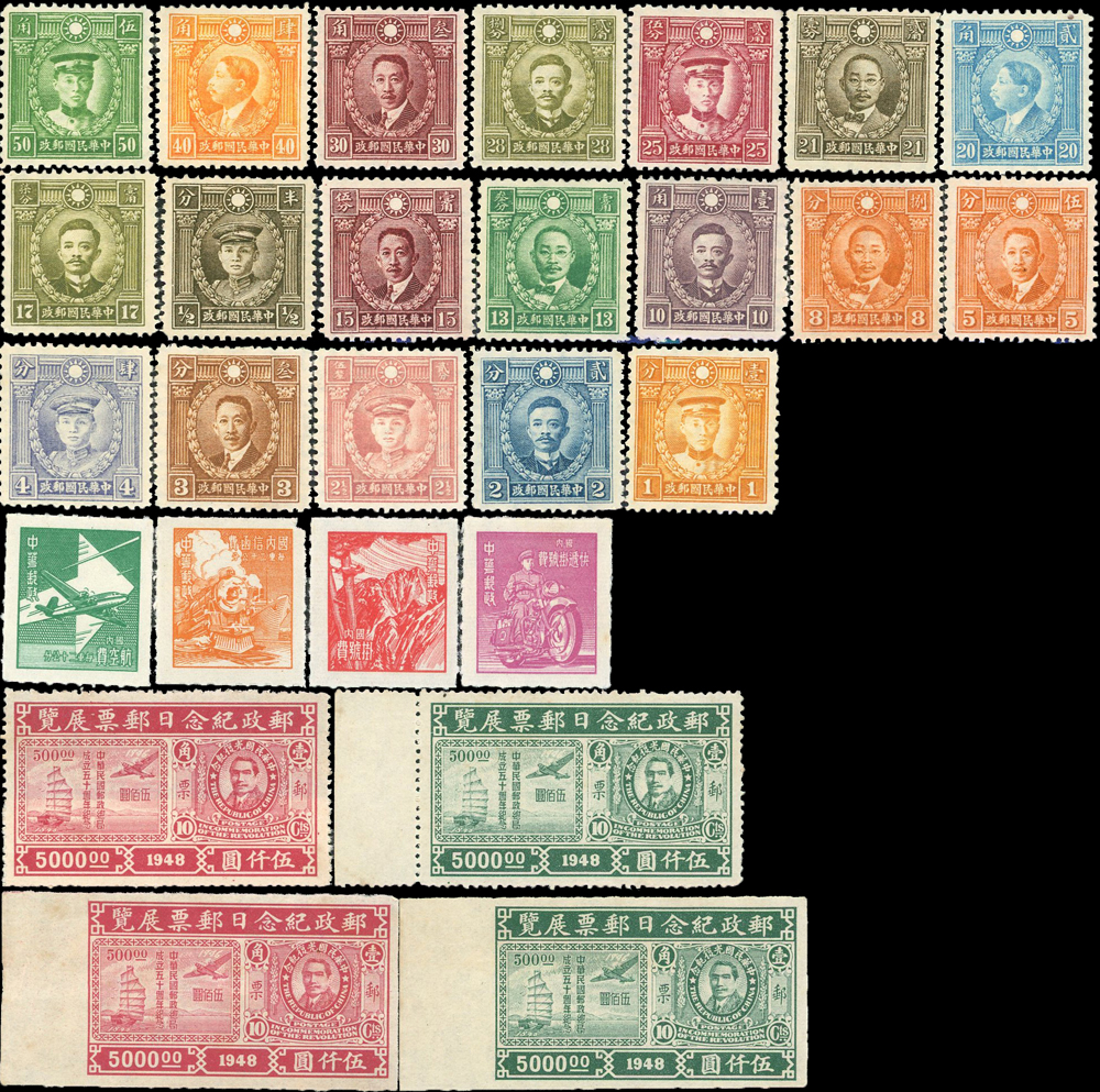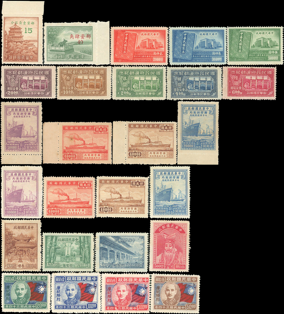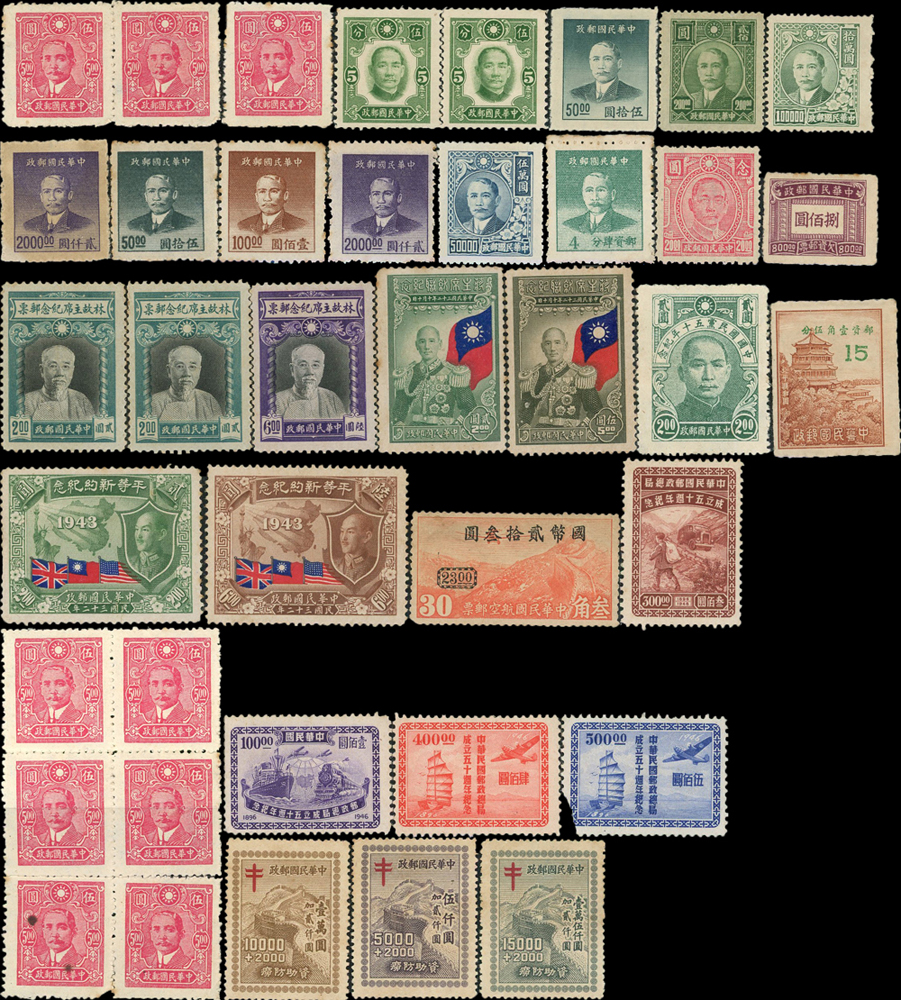 民國時期新票11套,包括:北平風景圖銀圓.蔣主席就職.郵政紀念日郵票展覽.慶祝勝利.行憲紀念.教師節.國民政府還都限東北.香港商務版烈士像(有水印).上海版單位(含航8)各1套,國營招商局75週年2套;另零散票新票39枚,舊票60枚,F-VF
