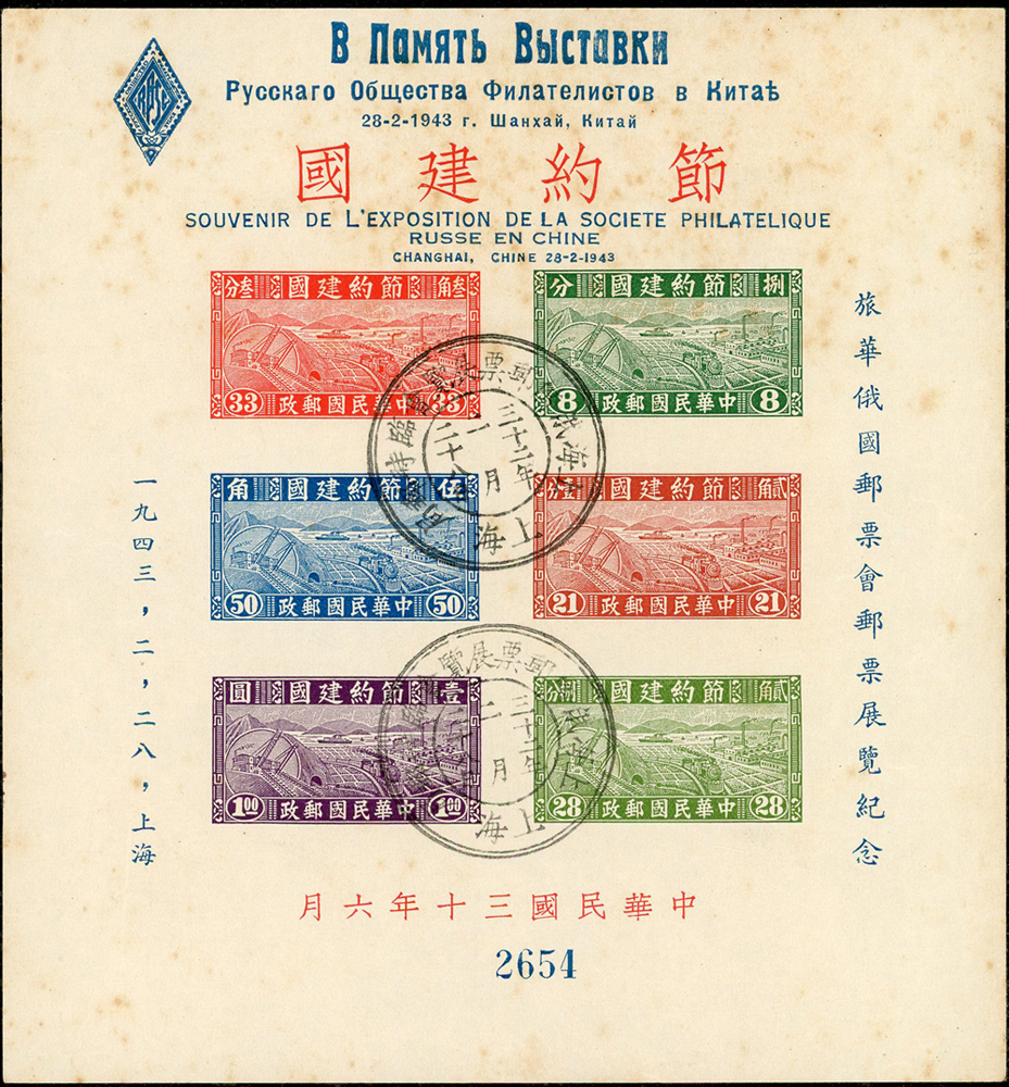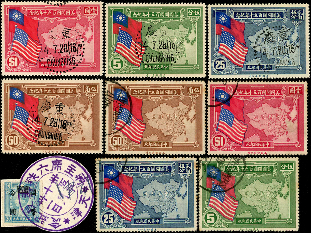 民國時期舊票:(1)專1B.節約建國加印「旅華俄國郵票會郵票展覽紀念 1943.2.28上海」小全張,蓋銷上海俄僑郵票展覽會臨時郵局32.2.28戳,斑點背貼,F-VF;(2)烈士像國幣20元銷蔣主席六秩壽辰/天津/35.10.31紀念全戳;(3)紀14.美國開國150週年4全2套,VF-F:(Page 27 )