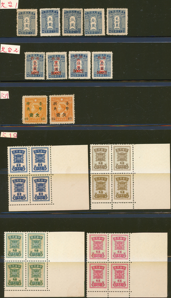 民國.台灣欠資新票29套,含:欠12.中信二版;欠13.上海版欠資(1枚背貼);欠14.倫敦二版改值欠資;欠東北1.限東北貼用欠資2套;欠東北2;欠台1;欠台2(500元折痕);欠17.先烈像改作欠資(貼痕);欠19.台北版欠資4方連;欠20.總統府改欠資4方連;欠21.莒光樓欠資6方連;欠22.五十五年版欠資郵票6方連;以上微黃或數點輕黃,VF-F