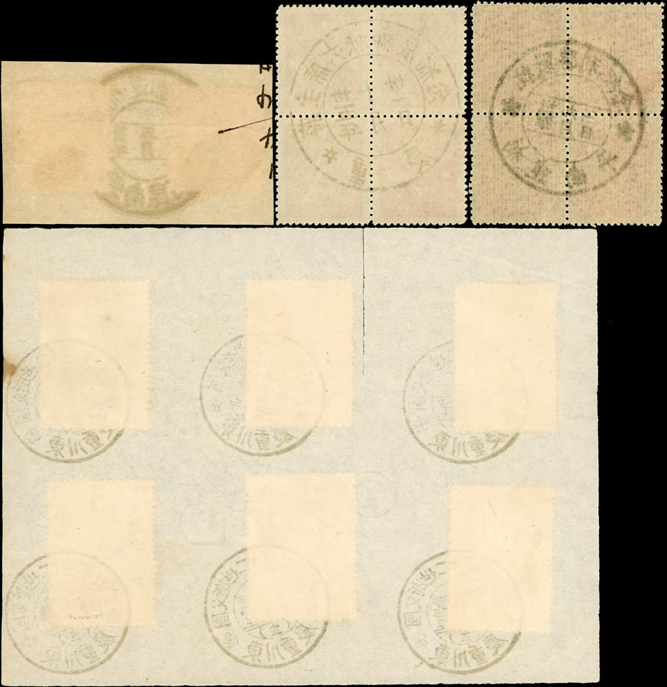 銷紀念全戳舊票4件:(1)國父像中信版3角方連2組,分銷:抗戰勝利紀念/卅四年九月三日/福建南平,蔣主席六秩壽辰紀念/卅五年十月卅一/重慶;(2)剪片貼國父像百城一版有齒4元.5元各1枚,銷慶祝還都紀念/卅五年五月五日/雲南昆明;(3)白紙貼國父逝世20週年6全,銷國父逝世二十週年紀念/三四年三月十二日/東川重慶(Page 30)