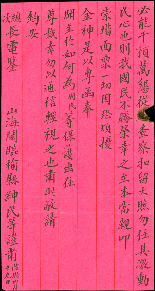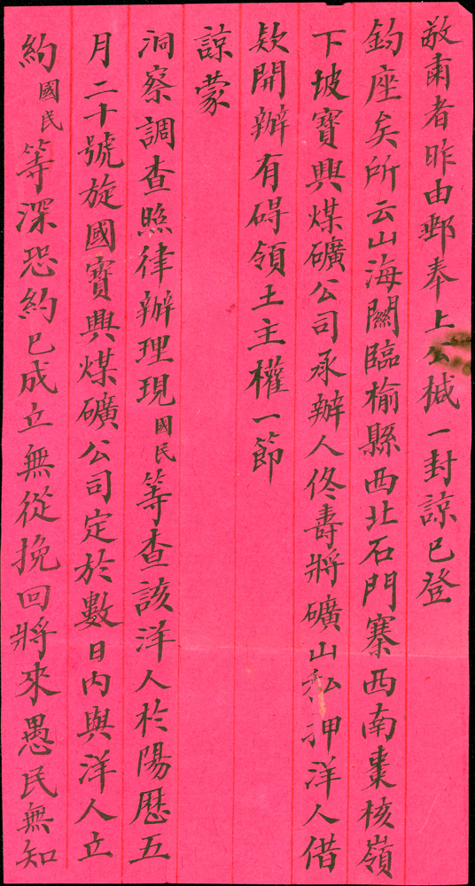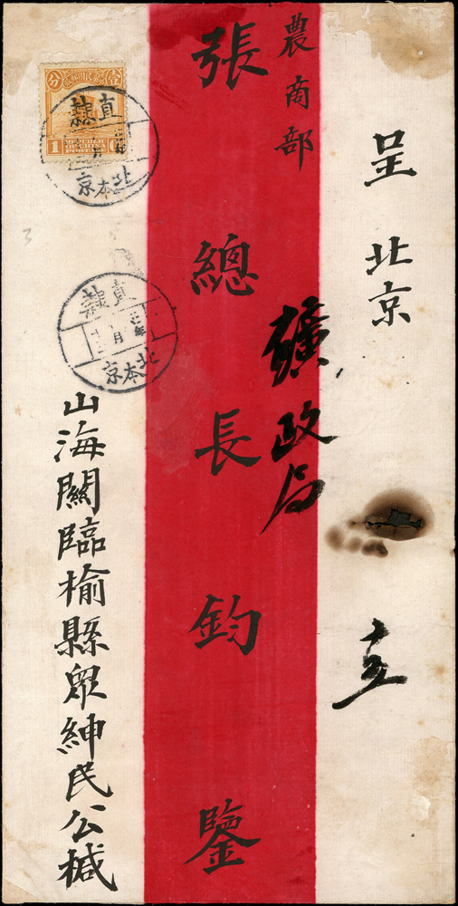 1914年紅條封貼倫敦版帆船1分1枚,銷直隸北京(本)3.5.13戳寄北京農商部,背銷北京(五)3.5.13戳,附內信,內容為檢舉礦場抵押洋人借款一事,封有灼痕(Page 33)