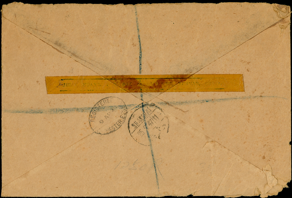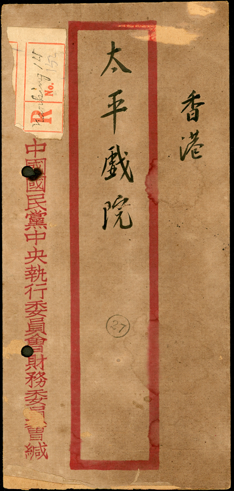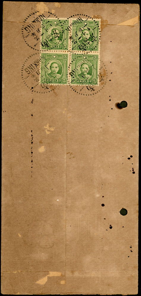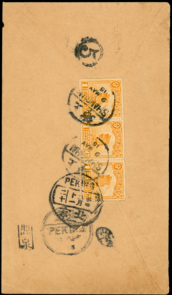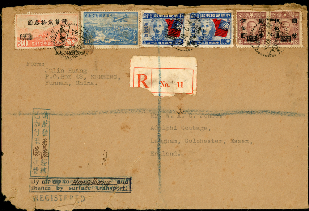 實寄封三件:(1)1915年上海寄北京封,背貼北京一版帆船1分3枚,銷上海9.MAY.15漢英小圓戳,北京五月十一日腰框到戳;(2)1937年中國國民黨中央執委會寄香港掛號封,背貼國父像倫敦版單圈5分4方連,銷南京卄六年一月十四;(3)1947年昆明寄英國航空掛號封,貼票6枚計1300元,銷昆明20.2.47經上海25.3.47,英國9.AP.47到戳,正面另銷『已加付至港航費請航發香港經轉』中英文指示戳(Page 33)