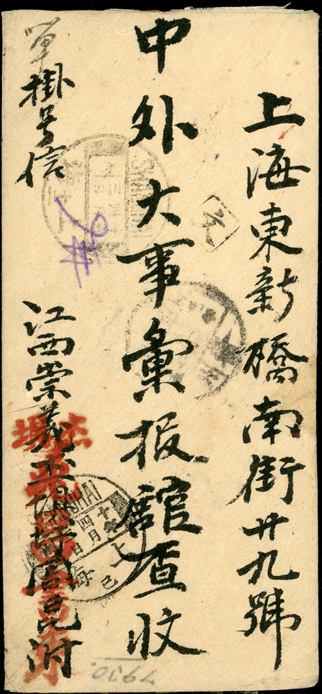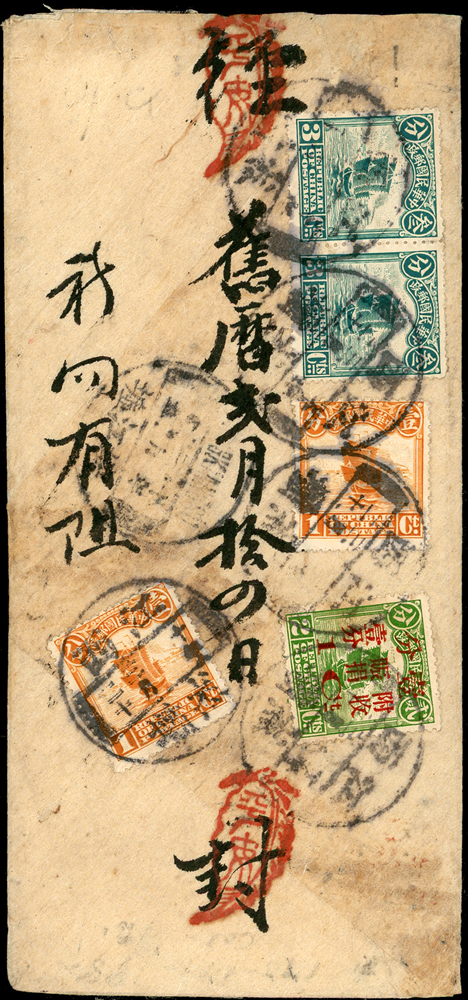 1921年江西寄上海中式掛號封,背貼倫敦版帆船3分及1分各2枚,帆船加蓋附收賑捐郵票1分1枚,銷江西杰壩十年三月二十腰框戳,經X江墟,贛州,上海十年四月三日到達戳(Page 34)