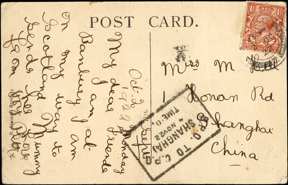 1922年英國寄上海黑白片,貼英郵1.5便士1枚,銷2.OC.22日戳,抵達上海英國客郵交換局銷『B.P.O. TO C.P.O./SHANGHAI/?.NOV.22』章(Page 34)