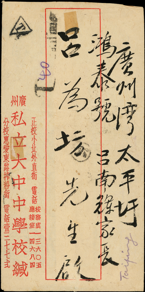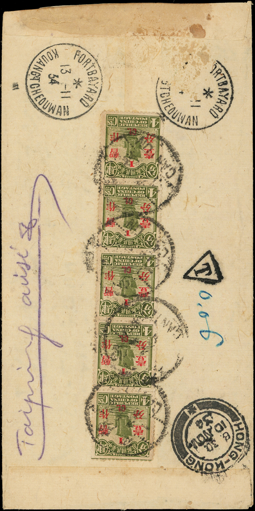 1934年廣州寄法租借廣州灣掛號封,背貼北京二版帆船4分加蓋暫作壹分直五連,銷廣州戳及掛號章(不清),經香港10.NOV.34中轉,廣州灣西營法國郵局FORTBAYARD KOUANGT CHEOUWAN 13-11.34到戳,另銷法國三角型『T』字欠資章(Page 35)