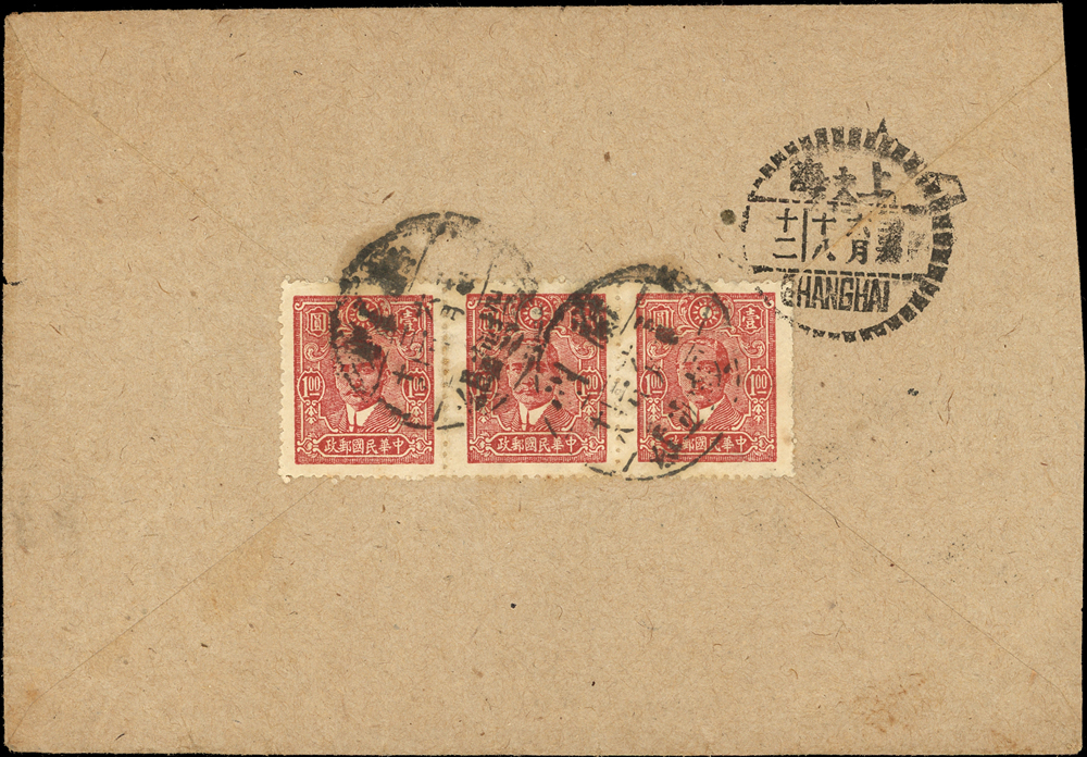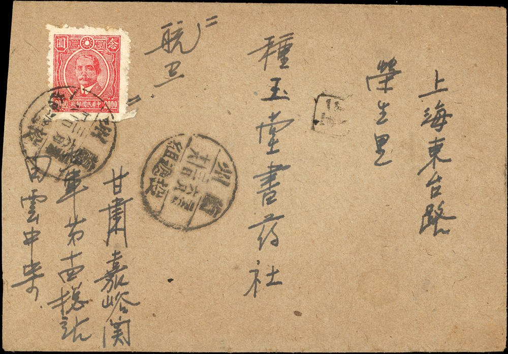 1946年蘭州寄上海航空封,正面貼國父像重慶大東版20元1枚,背面貼國父像中信版1元3枚,銷蘭州/投遞組三十五年六月三日,上海六月十八到戳;符合1945.10.1-1946.4.30國內信函20元+航空3元=23元(Page 41)