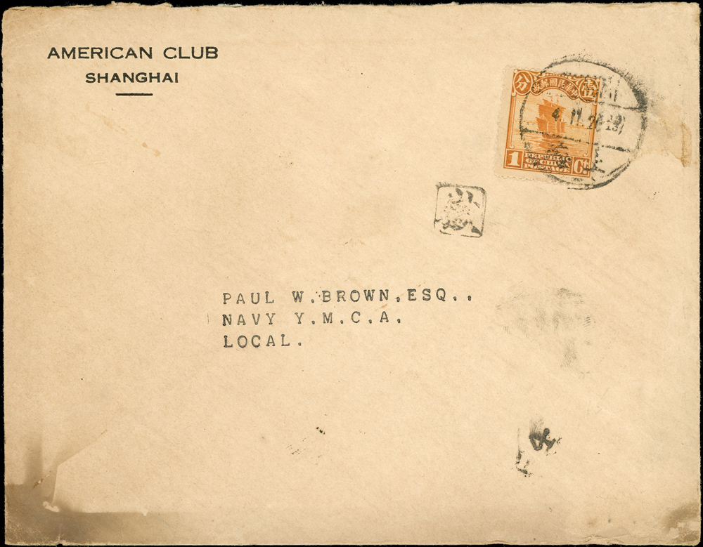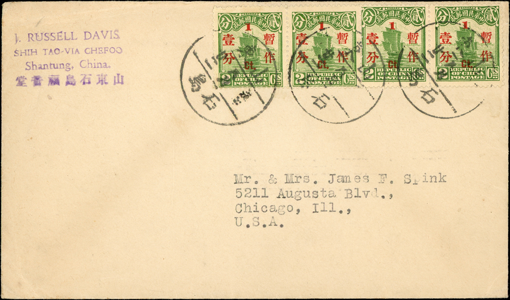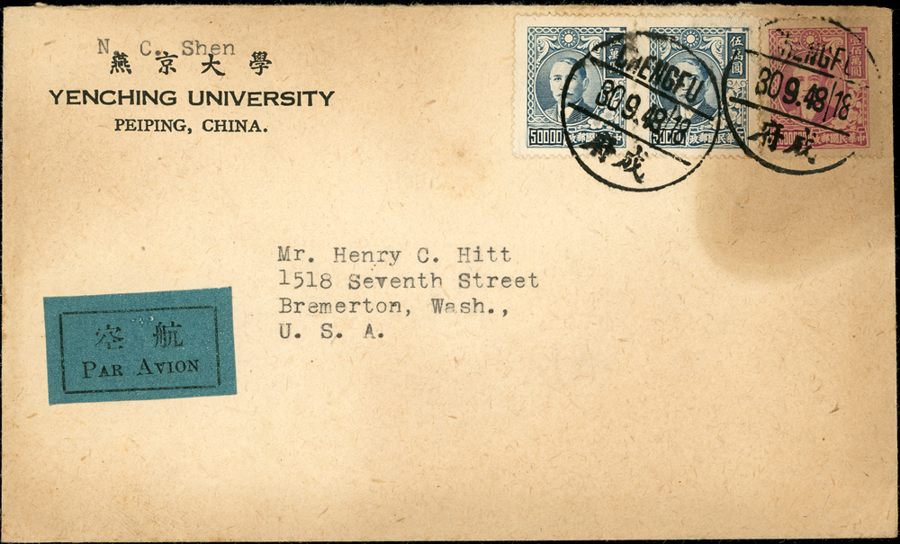 實寄封四件,票戳俱全:(1)1948年燕京大學寄美國航空封,貼國父像上海大東三版5萬2枚及100萬1枚,銷成府30.9.48;(2)山東石島福音堂寄美國封,貼二版帆船2分加蓋暫作壹分4枚,銷山東石島八月卄二;(3)1930年汕頭寄上海封,貼北京二版帆船1角1枚,銷汕頭7.2.30;(4)192X上海寄本埠封,貼北京二版帆船1分1枚,銷上海4.11.2X(Page 41)