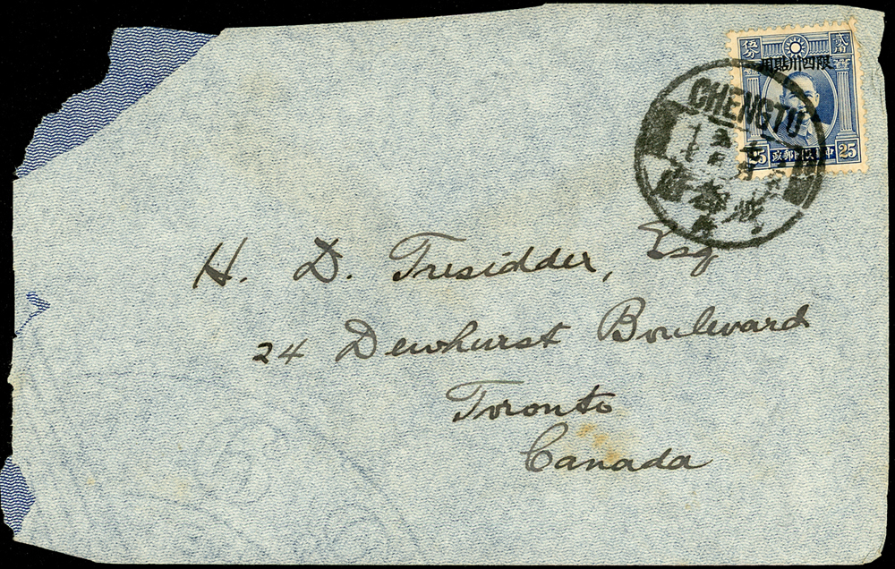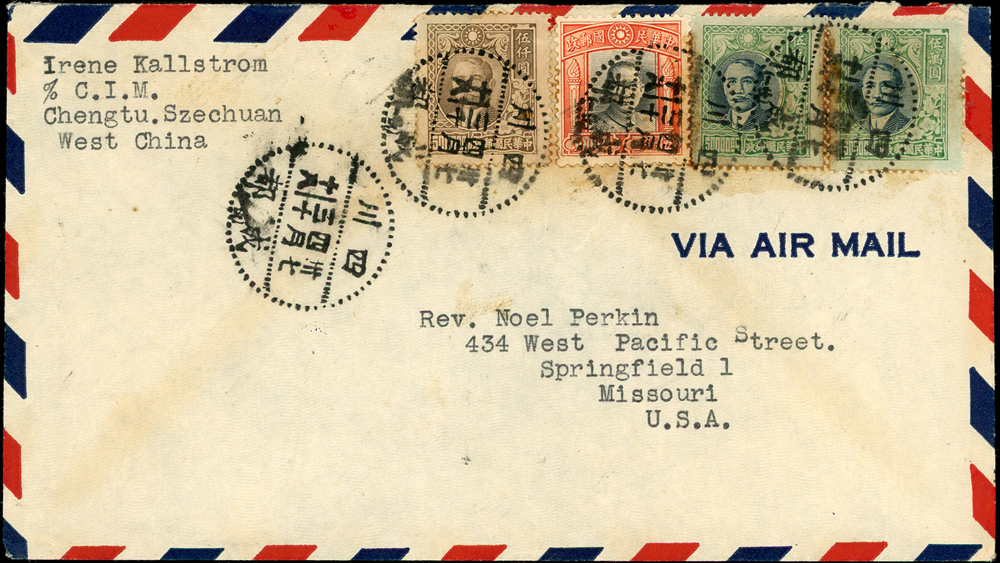 實寄封二件:(1)1948年西式封貼國父像倫敦四版5000元1枚,國父像上海大東二版5萬元2枚.5000元1枚,銷四川成都37.4.30戳寄美國,符合1948.4.11.1948.5.18國際信函3萬+航空8萬=11萬;(2)西式封貼國父像倫敦一版限四川貼用25分1枚,銷成都府X.7.5戳寄加拿大;林茂興舊藏(Page 42)