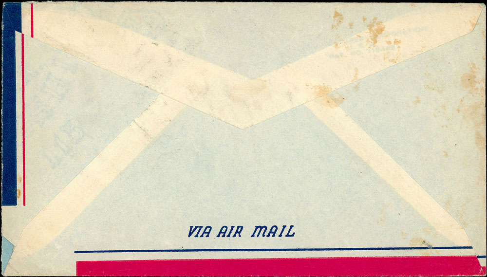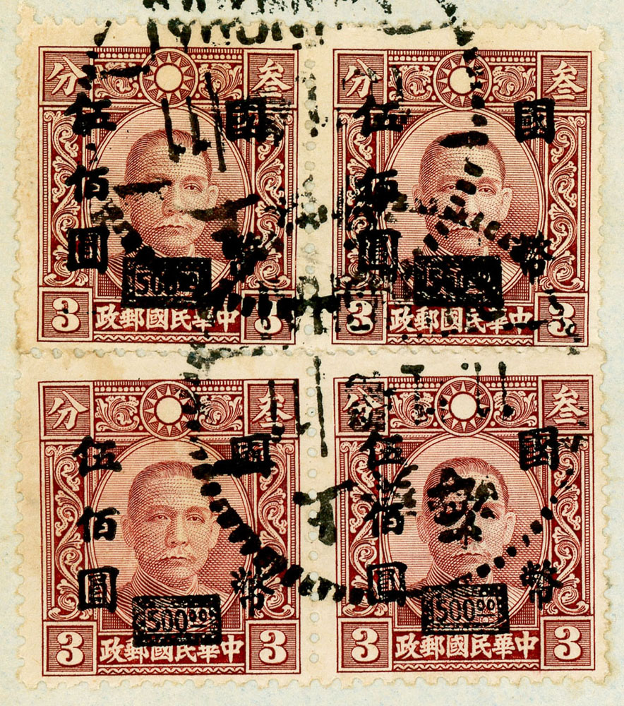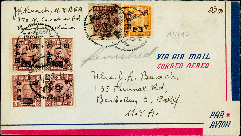 1948年上海寄美國封,貼上海永寧三次加蓋國幣500元/國父像香港中華版3分4枚(偽加蓋),100元/港烈1分1枚,國父像重慶中央版200元1枚,銷上海1948.1.11戳 註:當時的偽造國幣加蓋票主要用於騙取郵資用途,並非用於集郵或是商業用途,因此實寄封留存下來極為罕見,傳統郵集最佳素材(Page 42)