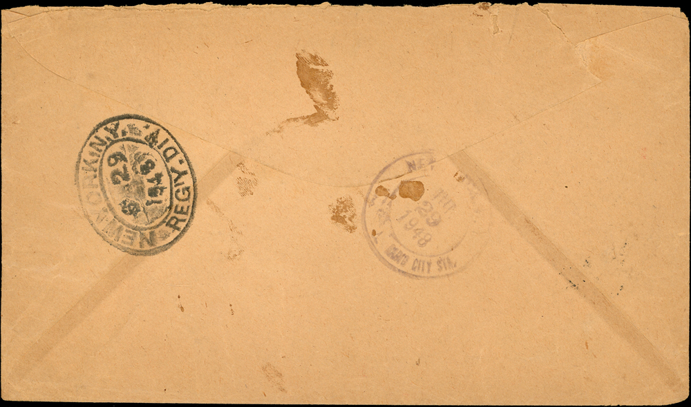 1948年上海寄美國航空掛號封,貼國父像上海大東二版20萬元2枚,國父像永寧一次加蓋改作壹萬元1枚,銷上海 25.6.48日戳,背銷美國 JUN.29.1948兩種日戳,局部輕黃(Page 42)