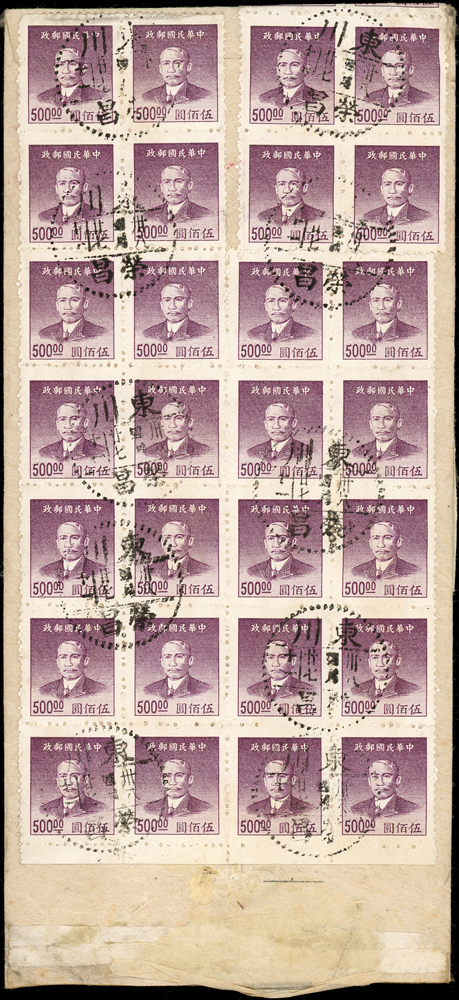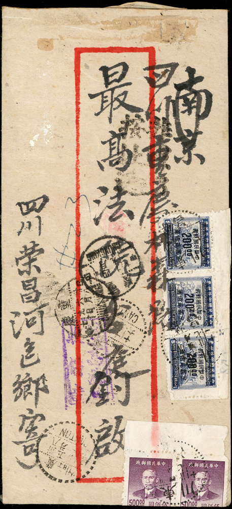 1949年四川榮昌寄南京最高法院掛號封,正背面貼金元票33枚計15600元,銷東川榮昌卅八.四月卄七,因故改址寄重慶,重慶卅八.四月卄九抵達,又改寄廣州,廣州卅八.五月抵達,最終又退回重慶,有重慶卅八.六月九日到戳,信封正面另蓋二枚指示戳,可惜不清(Page 42)