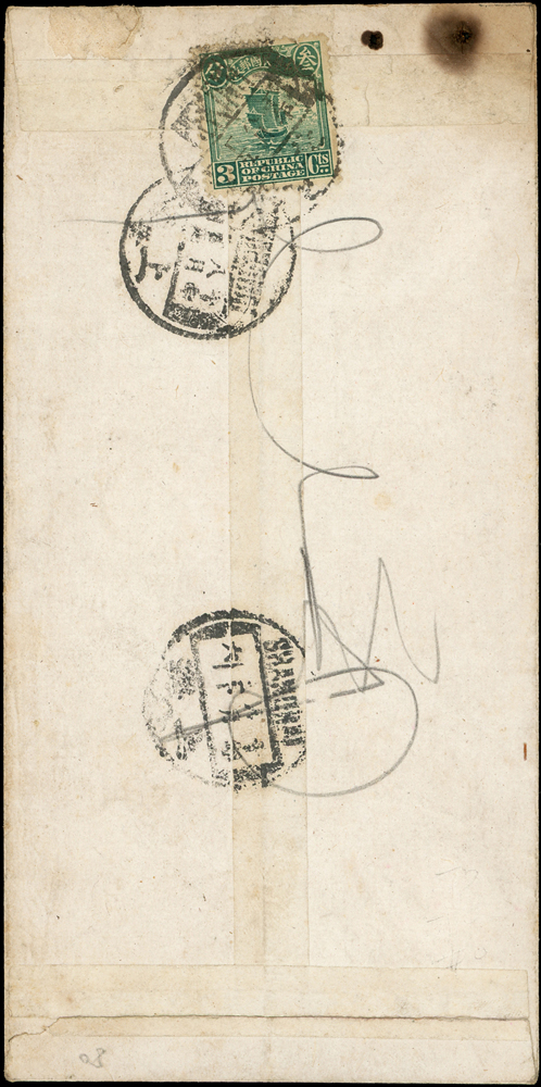 名人書信:1921年北京寄上海商務印書館胡適之先生,背貼帆船3分1枚,銷北平十年八月十五日,上海十年八月XX日到戳 註:胡適(1891年12月17日—1962年2月24日),字適之。生於江蘇省松江府川沙廳,籍貫安徽省徽州府績溪縣上莊鎮。曾任國立北京大學校長、中央研究院院長、中華民國駐美大使;天主教輔仁大學、南開大學校董會董事等職。胡適是新文化運動的奠基人與領袖之一,他興趣廣泛,著述豐富,在文學、哲學、史學、考據學、教育學、倫理學、紅學等諸多領域都有較為深入的研究,開風氣之先。(by 維基百科)(Page 43)