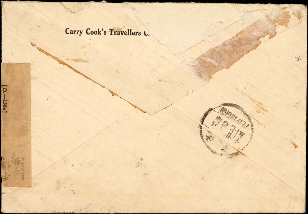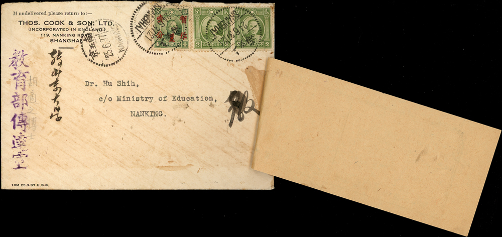 名人書信:1937年上海寄南京教育部胡適博士,貼國父像倫敦版單圈2分2枚及4分1枚,銷上海24.6.37,南京25.6.37到戳,加貼無法投遞貼條,手寫轉北京大學,背銷北平卄六年六月卄七到戳 註:胡適(1891年12月17日—1962年2月24日),字適之。生於江蘇省松江府川沙廳,籍貫安徽省徽州府績溪縣上莊鎮。曾任國立北京大學校長、中央研究院院長、中華民國駐美大使;天主教輔仁大學、南開大學校董會董事等職。胡適是新文化運動的奠基人與領袖之一,他興趣廣泛,著述豐富,在文學、哲學、史學、考據學、教育學、倫理學、紅學等諸多領域都有較為深入的研究,開風氣之先(by 維基百科)(Page 43)