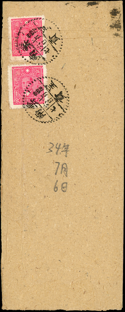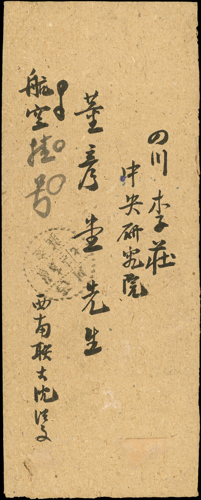 名人書信:1945年西南聯合大學寄西川中央研究院董作賓航空掛號封,背貼國父像中信版5元2枚,銷雲南呈貢卅四年七月六日,西川李莊卅四年七月十三日到戳 註:董作賓(1895年3月20日—1963年11月23日),原名作仁,入私塾後改名作賓,字彥堂,一字雁堂,號平廬。河南南陽人。知名文史學者,在考古學、殷商史、文字學、書法及篆刻藝術等方面頗有貢獻。曾任福建協和大學、中州大學教授,國立中山大學副教授,國立臺灣大學文學院和臺灣省立師範學院教授。1951年1至1955年8月,任國立中央研究院歷史語言研究所所長。(by 維基百科)(Page 42)