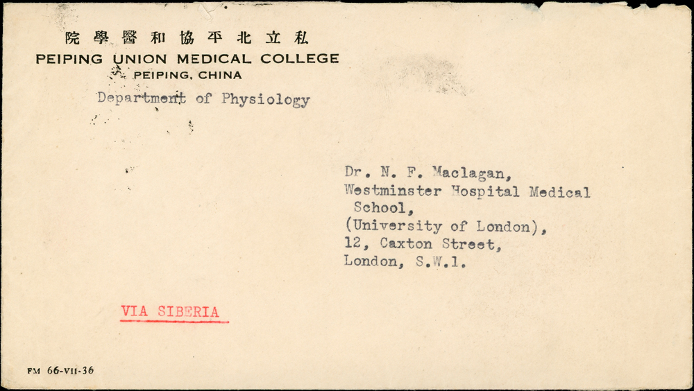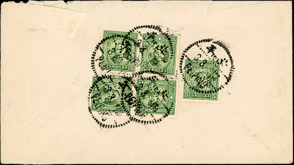 193X年北平寄英國水路封,背貼「PUMC防盜針孔票」國父像倫敦版單圈5分5枚,銷北平X.3.3英漢戳;林茂興舊藏 註:防盜針孔票PUMC=PEIPING UNION MEDICAL COLLEGE北平協和醫學院(Page 44)