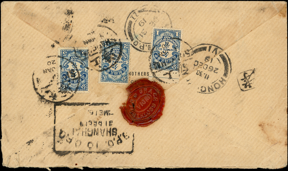 1919年加爾各答(CALCUTTA)寄上海欠資封,貼印度1.5安那1枚,銷戳不清,旁另銷菱形『T/8 cent』欠資章,經香港26.DEC.19,上海英國客郵局DE.31.19,上海英國客郵交換局銷『B.P.O. TO C.P.O./SHANGHAI/31.DEC.19』章,補貼北京一版欠資1分,2分及5分各一枚,銷上海1.JAN.20漢英小圓戳(Page 44)