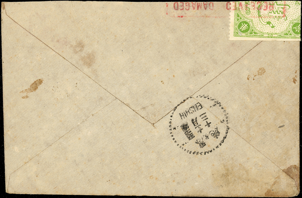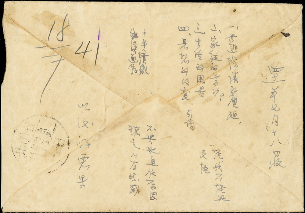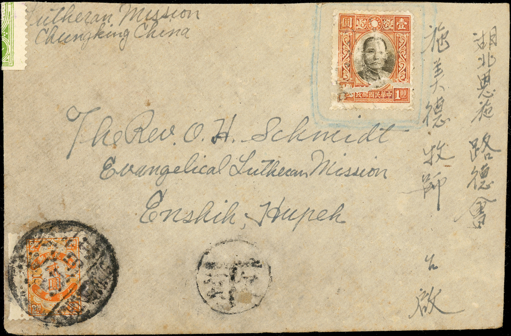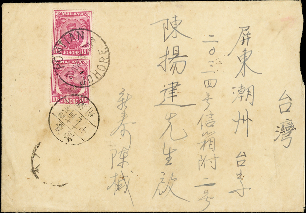 實寄封二件:(1)1943年重慶寄湖北封,貼國父像港大東1元1枚,因票面破損郵資失效,銷『T/欠資』章,旁加貼欠資2元(平信1元+罰款1元),銷重慶5.11.43(人為描過),背銷恩施三二年十一月十三到戳,並加貼郵局代封紙銷紅色方型章;(2)1952年馬來西亞寄屏東封,貼票馬來亞票2枚計2角,銷PONTIAN JOHORE 28.JUL.52,經台北中轉(日期不清),潮州四一年七月十七到戳;封背寫字;林茂興舊藏
