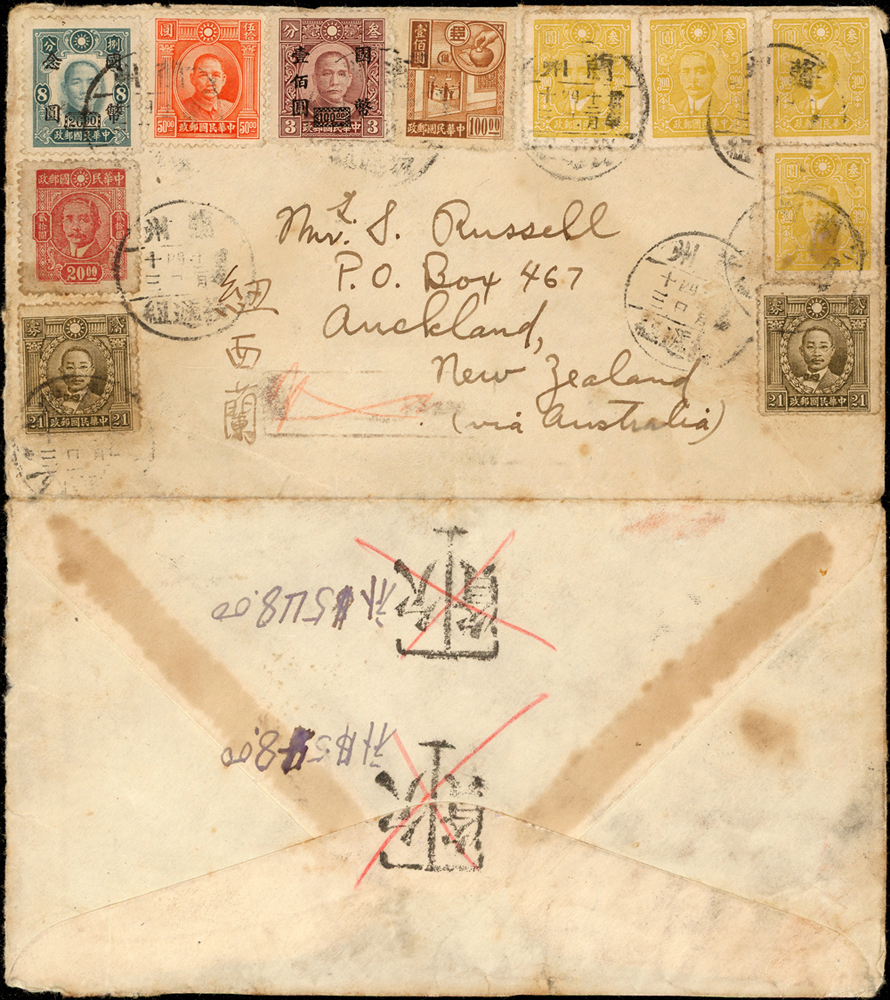 1946年蘭州寄紐西蘭掛號封,貼票11枚計國幣302.42元,銷蘭州/投遞組/卅五年十二月四日及長框掛號章,背蓋『T/欠資』章並手寫補$54800,未補資,掛號章及欠資章劃銷,封已剖開(Page 44)