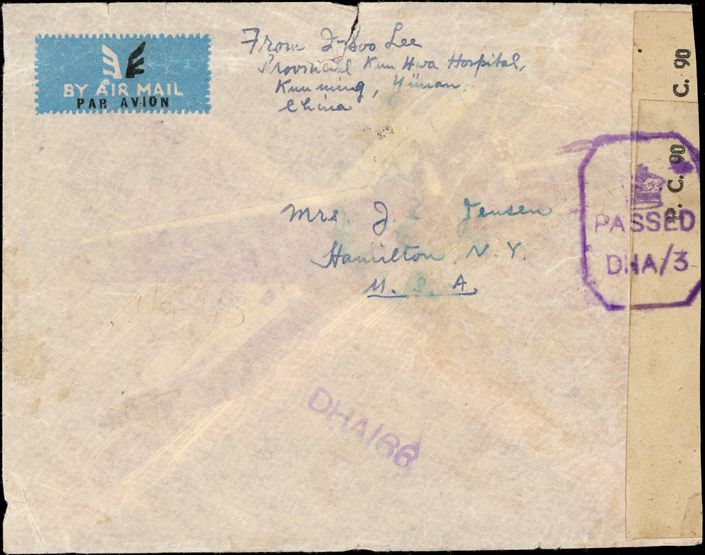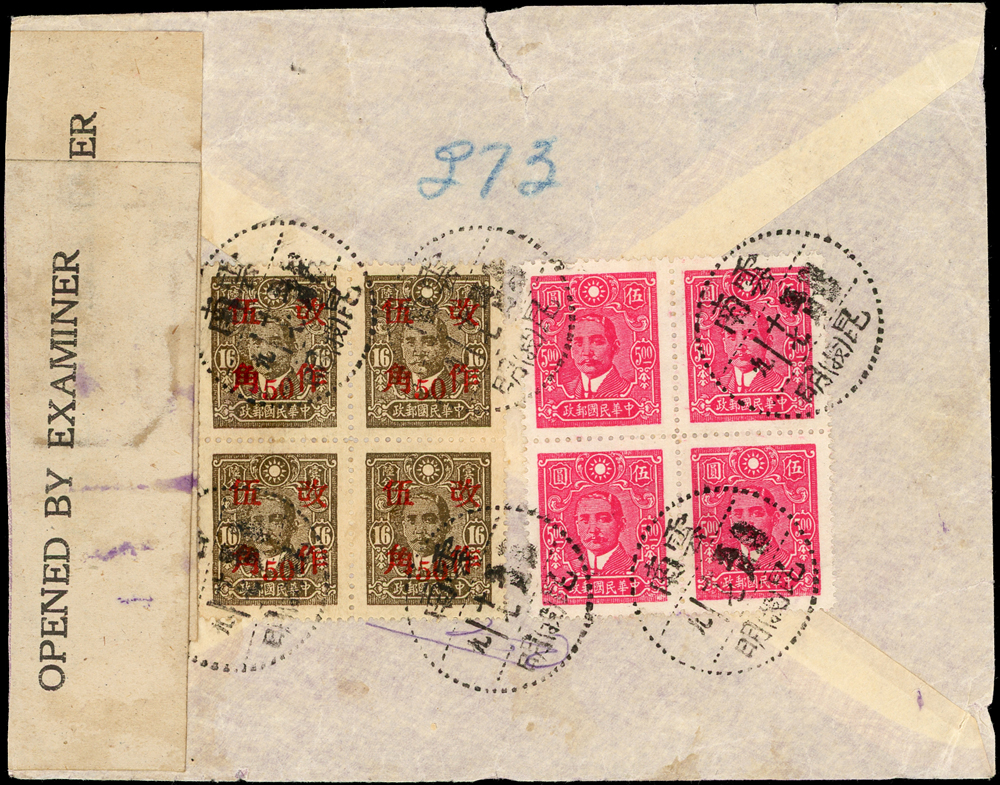 1940年代昆明寄美國航空檢查封,背貼國父像中信版『改作伍角』4方連.國父像中信版5元4枚,銷雲南昆明(投)X.5.17戳,封口貼有檢查封條銷英軍八角形檢查章及DHA/66章(Page 45)