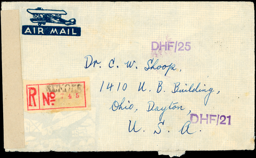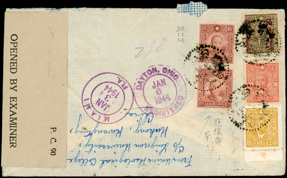 1943年廣東寄美國航空掛號檢查封,背貼國父像百城一版10元直雙連點線齒,國父像中信版3角及3元各一枚,廣東加蓋劃線伍角1枚,銷曲江三二年十一月十四中英戳,美國3.JAN.1944及6.JAN.1944轉落戳二枚,加貼檢查封條並銷DHF/21及DHF/25檢查章(Page 46)