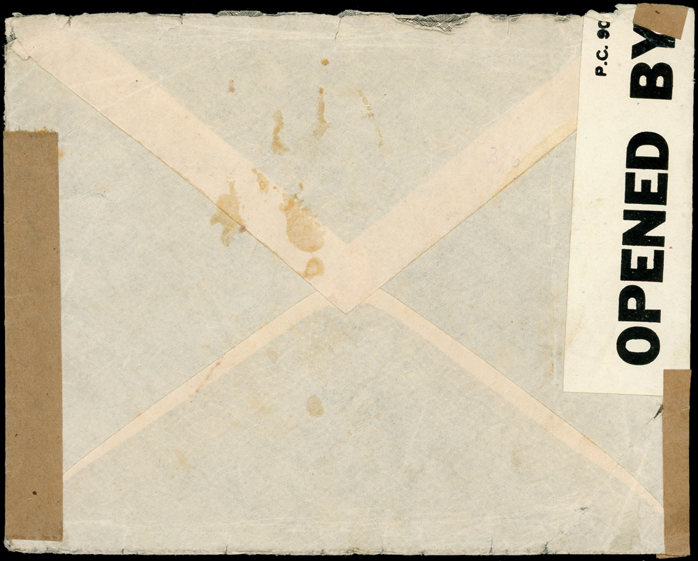 194X年重慶經印度寄英國航空檢查封,貼總局加蓋『改作伍角』1枚,國父像百城一版無齒20元1枚,銷重慶日戳不清,加貼檢查封條(Page 46)