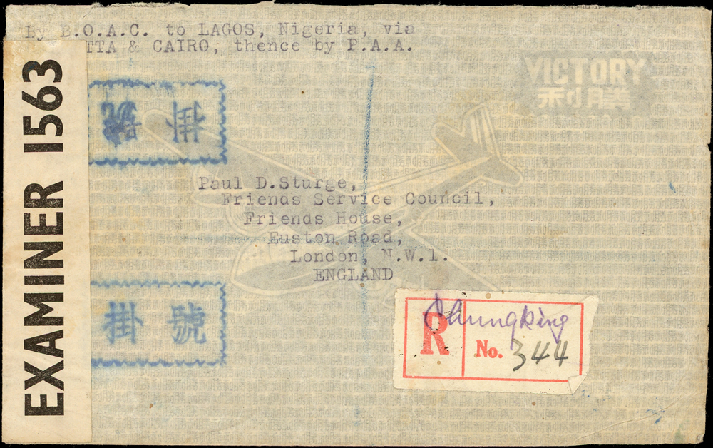 1943年重慶寄英國航空掛號封,背貼國父像紐約版5元.國父像中信版『改作伍角』.國父像香港大東版1角各1枚,國父像中信版1元2枚.5角1枚,國父像百城一版10元3枚,銷重慶32.2.9戳,加貼檢查封條(Page 46)