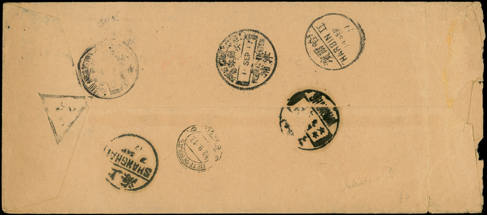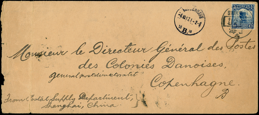 1917年上海寄丹麥封,貼北京一版帆船1角1枚,銷上海六年九月六日,背銷『津浦行動郵局/1X.SEP.17』,經哈爾濱14.SEP.17,丹麥6.10.17到戳(Page 46)