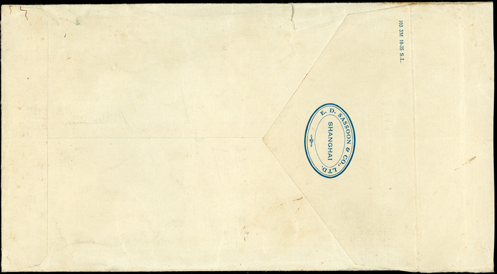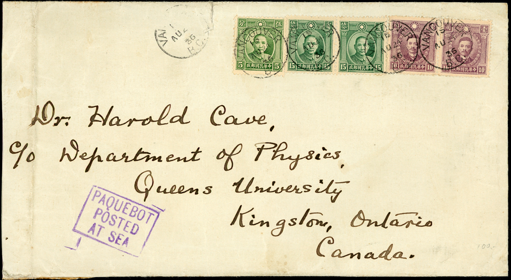 1936年上海寄加拿大船郵封,貼國父像倫敦一版1.5角2枚及5分1枚,北京版烈士像1角2枚,銷溫哥華1936.AU.24英文戳,旁另銷『PAQUEBOT POSTED AT SEA』船郵章(Page 46)