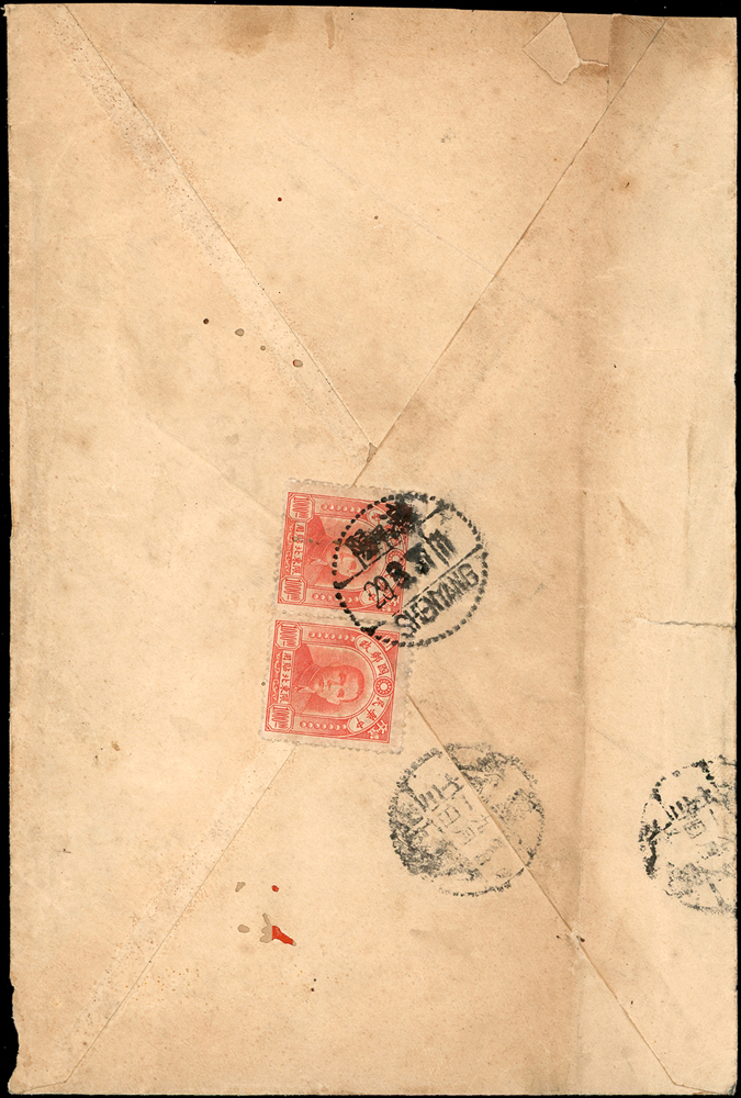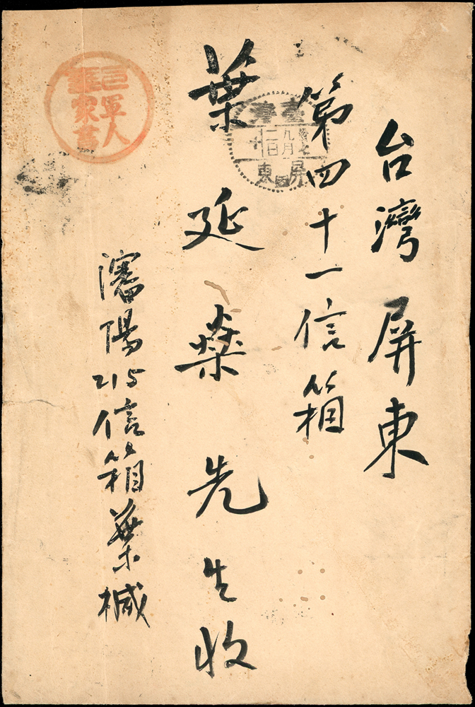1948年瀋陽寄台灣屏東航空封,背貼國父像北平中央二版限東北貼用1000元橫雙連,銷瀋陽29.8.37,經臺灣臺北九月一日,台灣屏東卅七.九月二日到戳,正面另銷紅色『軍人家書』章;封蛀孔,附內信(Page 47)